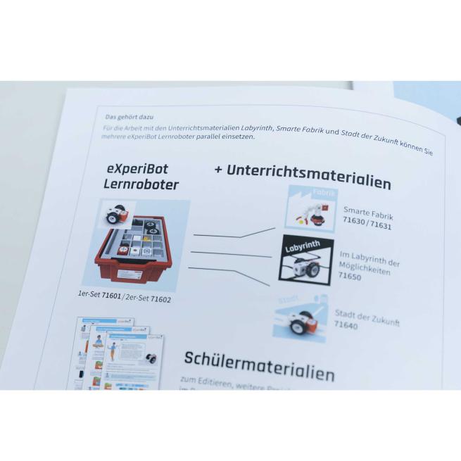 Jeder eXperiBot hat eine eigene Aufgabe, wie das Transportieren, Greifen und Versetzen bzw. Sortieren von Paketen. Zusammen mit dem umfassenden, ebenfalls enthaltenen (aber auch über die Internetseite des Verlags herunterladbaren) Unterrichtsmaterial ergeben sich für Ihren MINT-Unterricht, fächerübergreifend oder das nächste Schulprojekt zahlreiche interessante und praxisorientierte Aufgabenstellungen. Diese sind unterschiedlichen Lernstandsniveaus angepasst und begeistern Ihre SuS sofort für das Entwickeln von Lösungen: Welche Fahrgeschwindigkeit ist ideal, damit der Schieber nicht von seinem Fahrweg abkommt? Lässt sich die Transport- und Sortierzeit für die Pakete verbessern? Welche jeweiligen Programmier-Befehle erteilen wir, damit die einzelnen Roboter optimale Drehbewegungen durchführen?