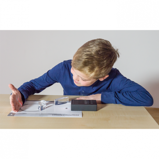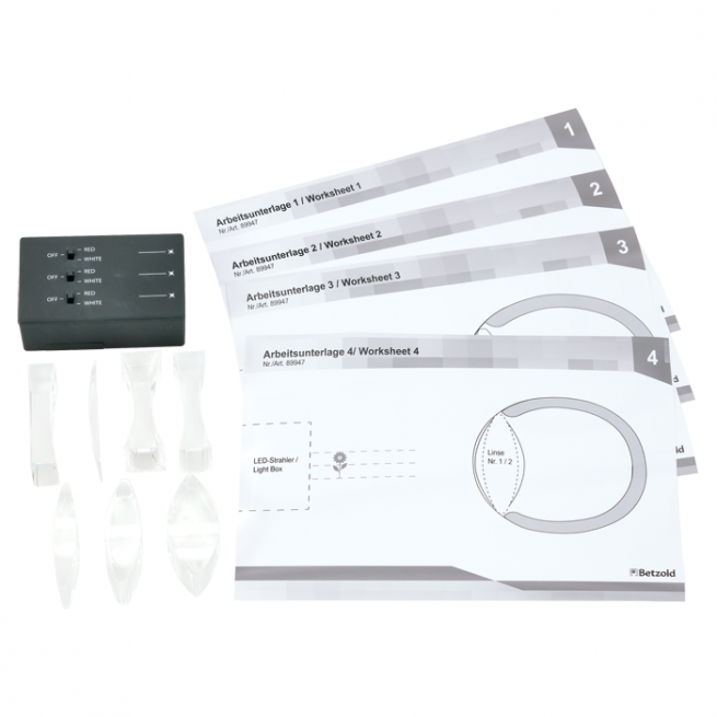 - Linsen: H x B: 7,5 x 2,5 cm, 0,6-3,4 cm stark<br/>Strahlerbox: 10,8 x 7 x 2,8 cm<br/>Arbeitsunterlage: 29 x 20,5 cm<br/>Handreichung: ca. 25 x 19 cm <br/><br/>