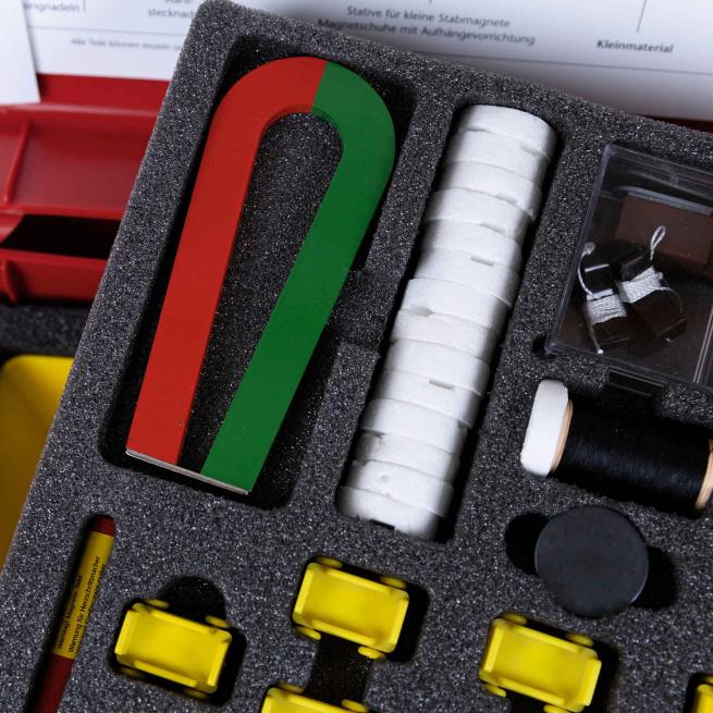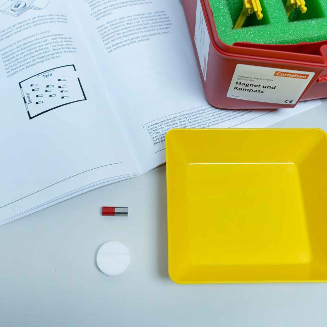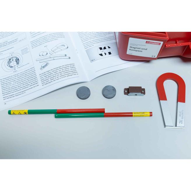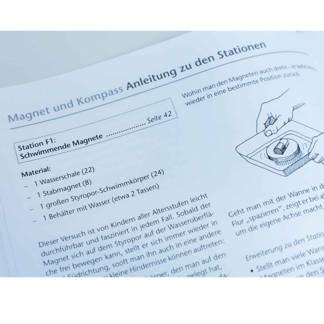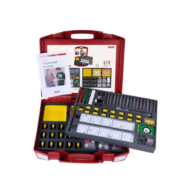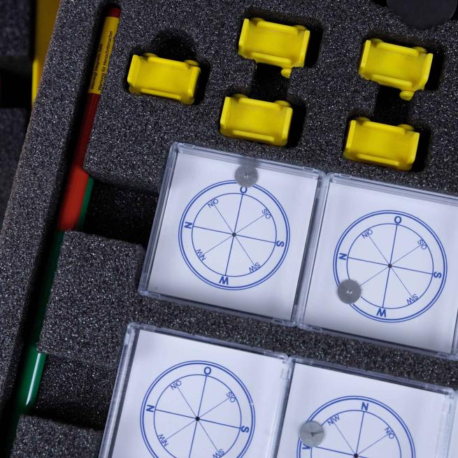 Das Material des Experimentierkoffers ist so ausgewählt, dass Sie damit jeweils eine komplette Unterrichtseinheit zu den verwandten Themen Magnet und Kompass durchführen können. Ihre Schüler untersuchen dabei selbstständig die Eigenschaften von Magneten und bauen selbst einen Kompass zusammen. Bis zu 15 Gruppen aus dem 1. – 3. Schuljahr setzen sich in anschaulichen Experimenten damit auseinander, welche Bedeutung Pole, Magnete, die Nord-Süd-Richtung und der Kompass haben.