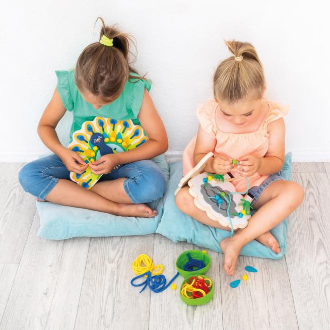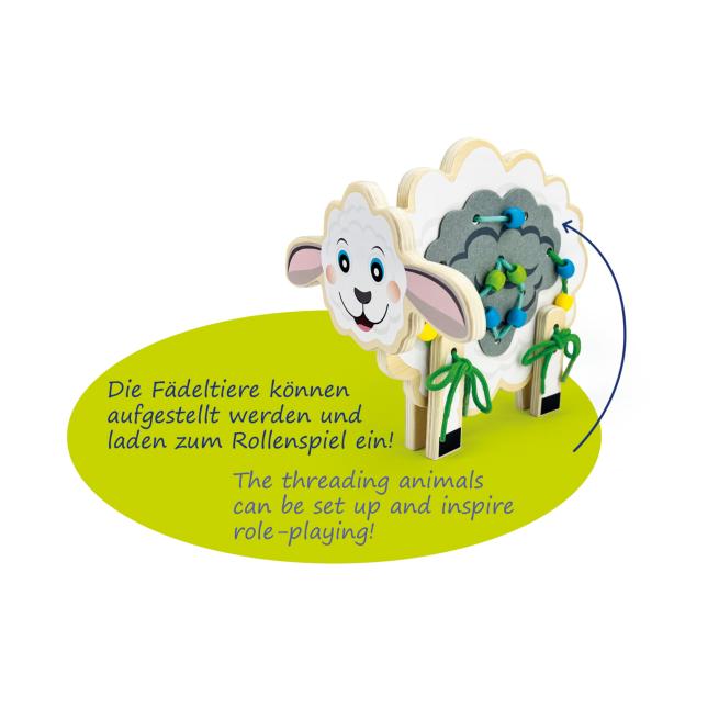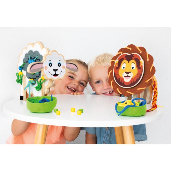 Kinder können die Tiere immer wieder auf neue Arten auffädeln und gestalten. So unterstützen Fädelspiele das Verständnis von Mengenverhältnissen, Symmetrie und das Bilden von Reihen und fördern gleichzeitig strukturiertes Arbeiten. Zusätzlich zum freien Spiel mit Schnüren und Perlen bieten mitgelieferte Vorlagekarten vielfältige Ideen für das Kreieren hübscher Tierfiguren. Ein besonderes Highlight: Die Fädeltiere sind standfest und regen zu kreativem und gemeinschaftlichem Rollenspiel an! Ideal für die ganze Gruppe.
