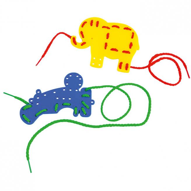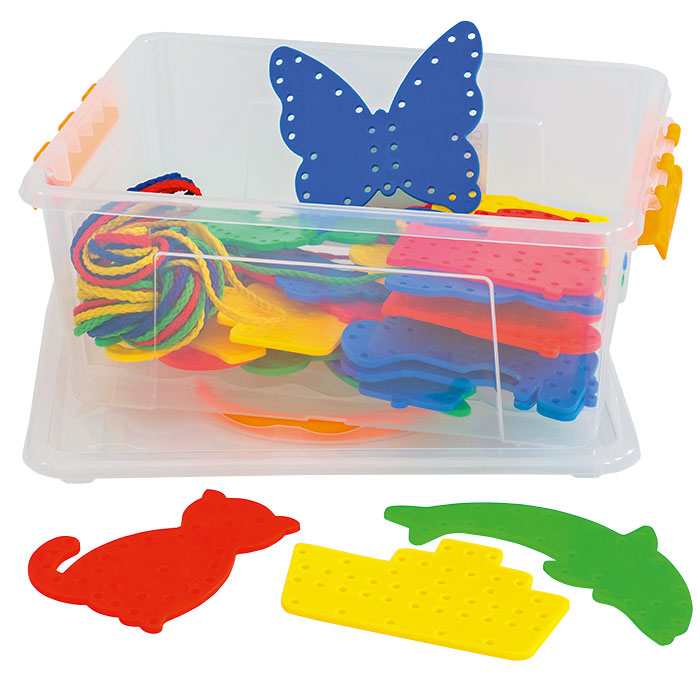 Farben zuordnen und mitzählen durch wie viele Löcher die Schnur gezogen wird. Auffädeln fördert die Auge-Hand-Koordination und trainiert das Zählen. Die Löcher in den unterschiedlich farbigen Platten in beliebten Formen sind ausgestanzt. Mit praktischer Aufbewahrungsbox.