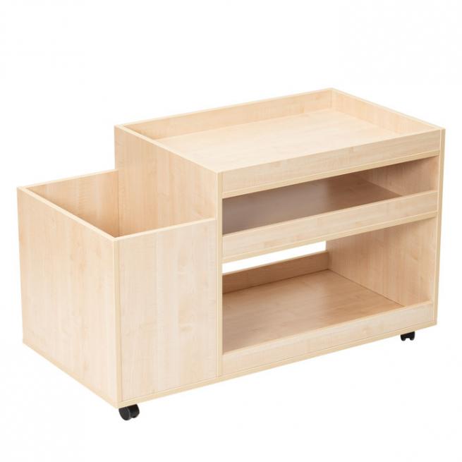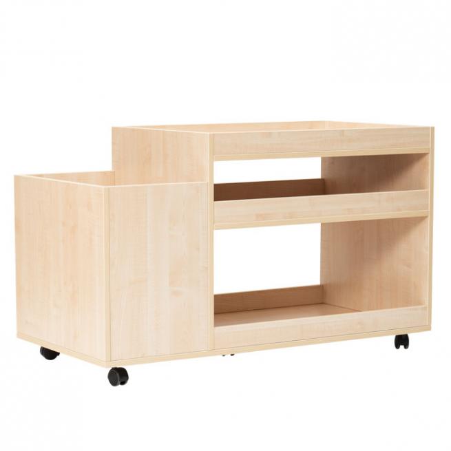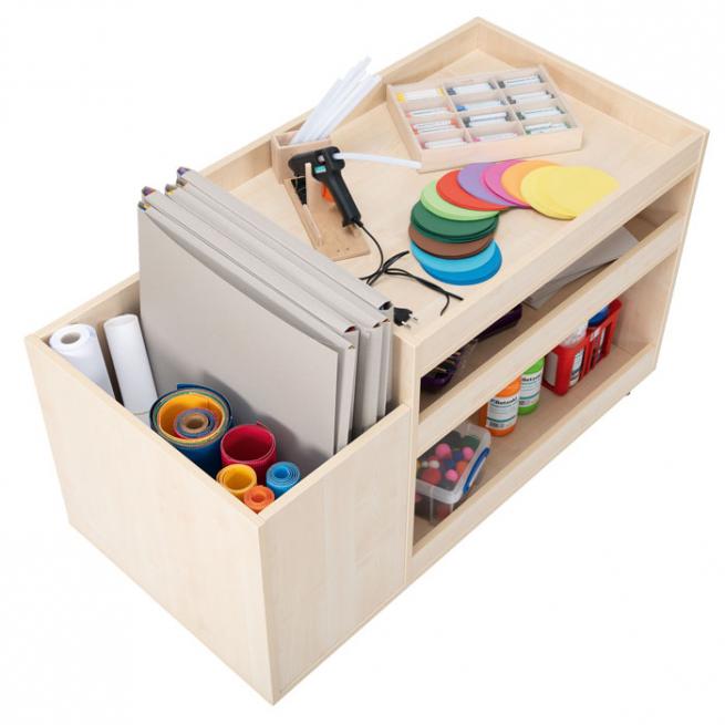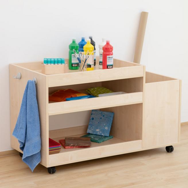 Im fahrbaren Multimobil ist Bastelmaterial griffbereit aufgeräumt. Sämtliche Utensilien bleiben durch die Aufkantung an den 3 Ablagefächern an Ort und Stelle. Die 2-mm-ABS-Kante schützt vor Stößen und Feuchtigkeit. Im unteren Fach lagern Sie z. B. Kanister oder Flaschen mit einer Höhe bis 28,5 cm. Papierrollen, große Zeichenblöcke und Sammelmappen (bis 50 x 70 cm) verstauen Sie bequem im Seitenfach. Dank der 5 Rollen bewegen Sie das robuste Mobil flexibel. Für den sicheren Stand stellen Sie 2 Rollen fest. Mit einem feuchten Tuch wischen Sie Verschmutzungen oder Farbe einfach ab.