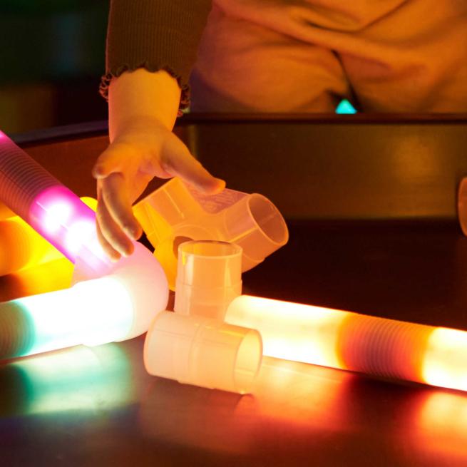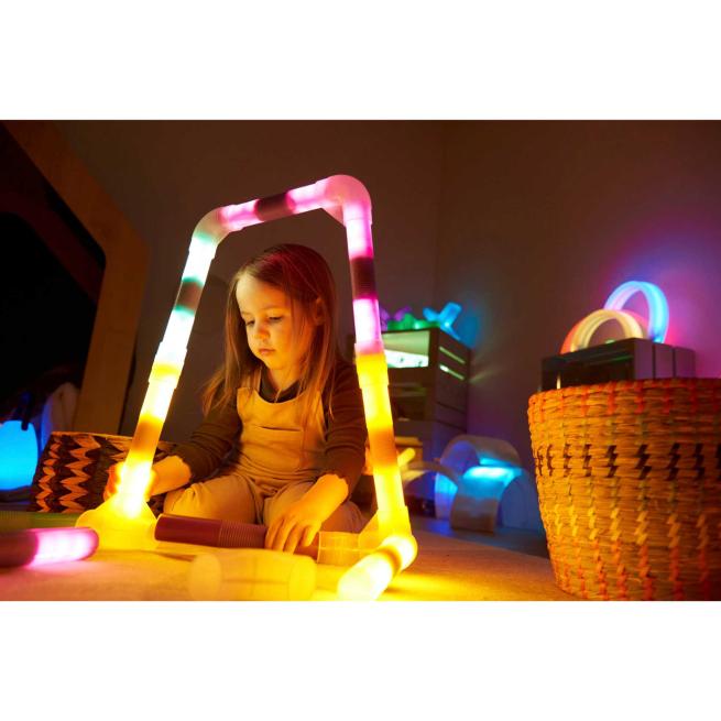 Mit den Farb-Licht-Stäbe-Steckverbindern verbinden Kinder die beliebten Lichtstäbe zu kreativen Bauwerken wie Netzen, Häusern oder Brücken. Die 18 stabilen Kunststoff-Verbinder sind leicht zu handhaben und erweitern die Spiel- und Experimentierideen im Lichtspiel. So entstehen beeindruckende Konstruktionen, die spielerisch Fantasie und Wahrnehmung fördern.