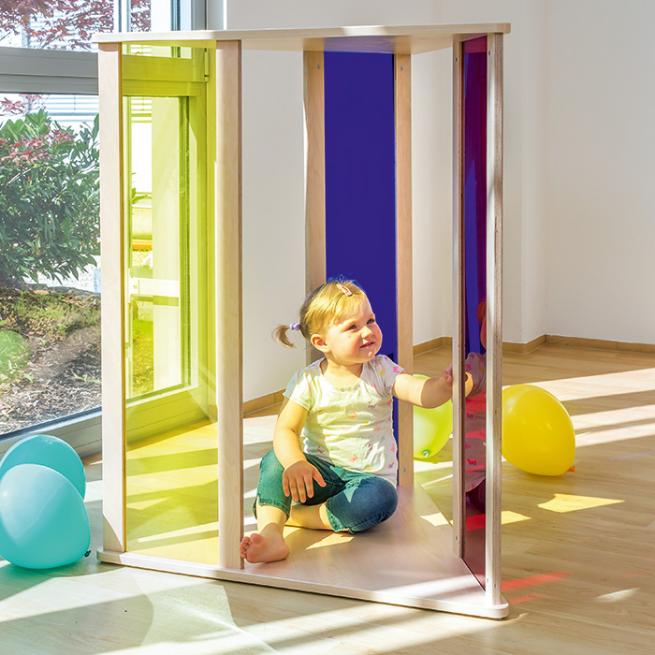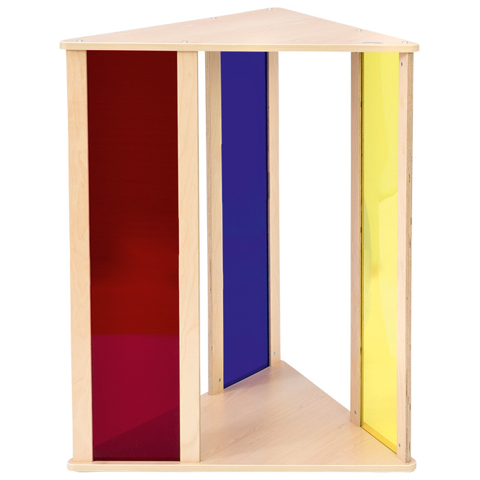 Eine echte Farbdusche, dieser tolle Dreieck-Raum. An jeder Seite gibt es eine Acrylglasscheibe in einer der drei Grundfarben. Das einfallende Licht wird gebrochen und die Farben mischen sich im Innenraum. Schauen die Kinder hinaus und beobachten die Umgebung, erscheint alles wie in Farbe getaucht. Das macht Kindern Spaß und fördert ihre visuelle Wahrnehmung.
