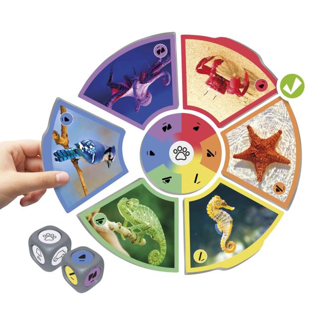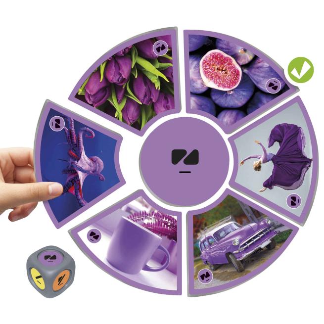 Zum Spiel gehören 36 Fotokarten, 6 beidseitig bedruckte runde Farb-/Kategoriekarten und 2 Maxi-Würfel (je einer für Farbe und Kategorie). Ein Satz ergänzender Aufkleber dient dazu, den Würfel und damit das Spiel zu modifizieren. Die Fotokarten zeigen echte Aufnahmen u. a. von Tieren, Pflanzen, Gegenständen oder Lebensmitteln. Die Fotokarten haben stets einen je passenden Farbrand, Fotokarten zu den Primärfarben Rot, Gelb und Blau zusätzlich eine kleine Lasche. Das erleichtert vor allem kleinen Kindern die farblichen Zuordnungen. Die Kategorieseiten der runden Karten besitzen mittig ein Kategoriesymbol (entsprechend den Themen der Fotokarten) und je 6 Farbfelder für Rot, Gelb und Blau (Primärfarben) sowie Orange, Grün und Violett (Sekundärfarben).
