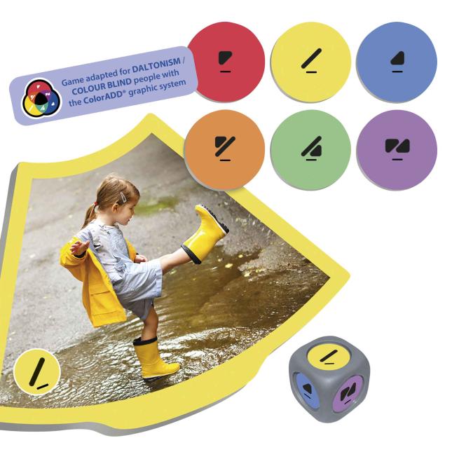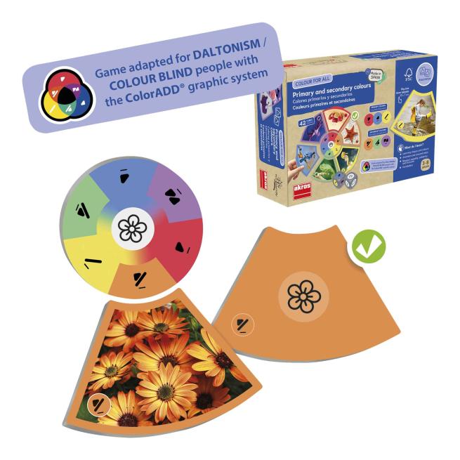 Auf dem gesamten Spielmaterial sind die jeweils passenden Farbzeichen des ColorADD®-Farbalphabets aufgedruckt. Dies ermöglicht auch farbenblinden Kindern eine vollumfängliche Teilnahme am Spielgeschehen. Zugleich erlernen auch die anderen Kinder die Symbole des ColorADD®-Farbalphabets kennen und integrieren diese wahlweise in ihr eigenes Spiel. Das lässt sie zugleich eine Sensibilität dafür entwickeln, dass Menschen unterschiedlich empfinden und dieselbe Umwelt mitunter sehr verschieden wahrnehmen.
