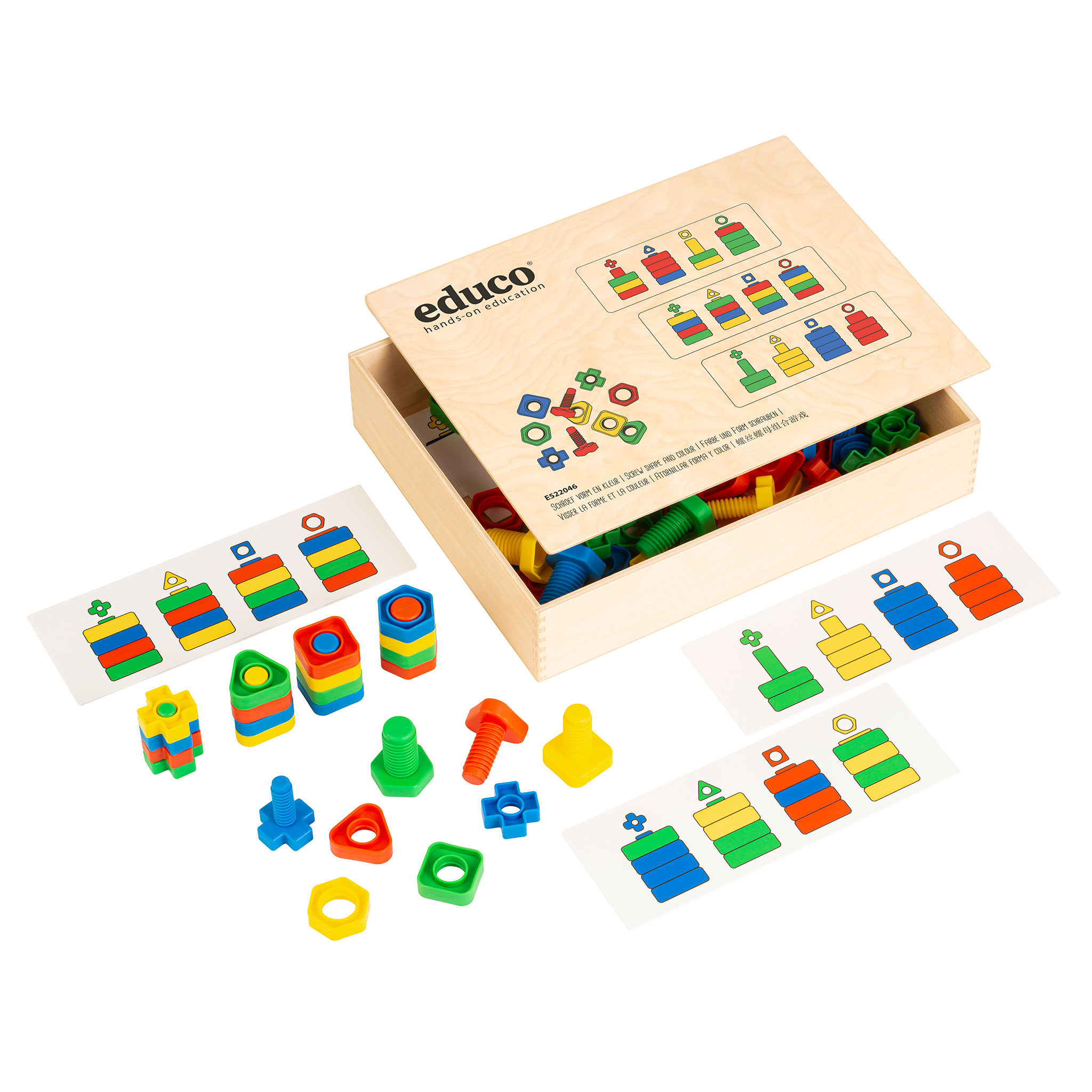 Anhand des Lernspiels mit bunten Schrauben und Muttern bauen die Kinder Kombinationen der Aufgabenkarten nach oder entwickeln eigene Reihenfolgen. Dies fördert die Bildung von Ordnungsstrukturen, die Hand-Auge-Koordination, die Feinmotorik sowie die Farb-und Formerkennung.