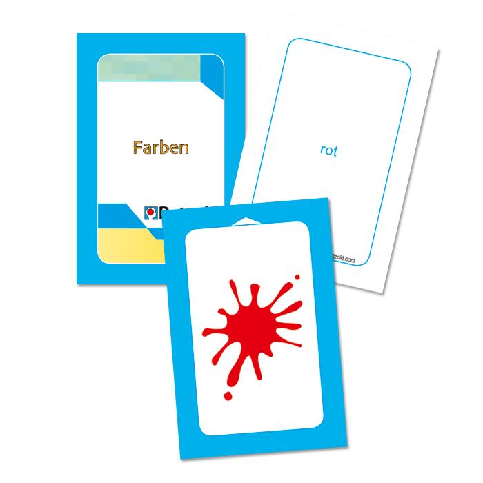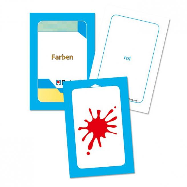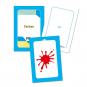 36 Karten, doppelseitig bedruckt. Die Vorderseite zeigt ein Bild, die Rückseite das entsprechende Wort. Auch für den
