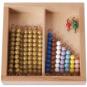 Farbige Perlenstangen von 1 bis 9 und 9 Zehnerstangen gehören zu diesem Material. Die Schüler lernen die Mengen kennen und benennen diese. Die Begriffe „mehr“ und „weniger“ werden gefestigt.