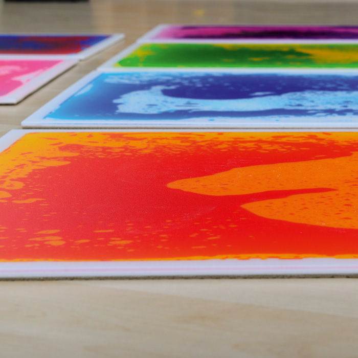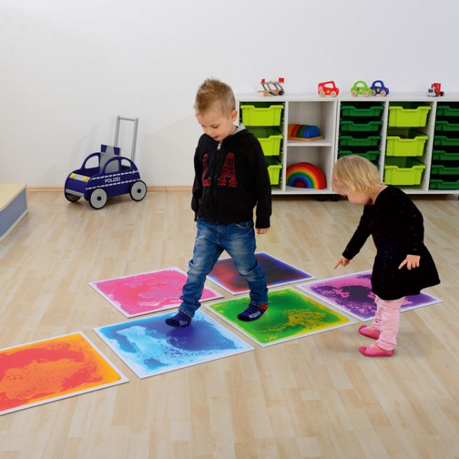 Begehbare Kunstwerke. Faszinierend – beim Begehen entstehen immer wieder neue Muster. Super zur Förderung von Koordination und Gleichgewicht. Die Matten sind absolut dicht und mit einer ungiftigen Flüssigkeit gefüllt. Die rutschfeste Unterseite sorgt für die Bodenhaftung. Ihre 3,5 mm starke Schutzschicht ist besonders kratz- und abriebfest. Jede Matte ist bis 90 kg belastbar und recycelbar.