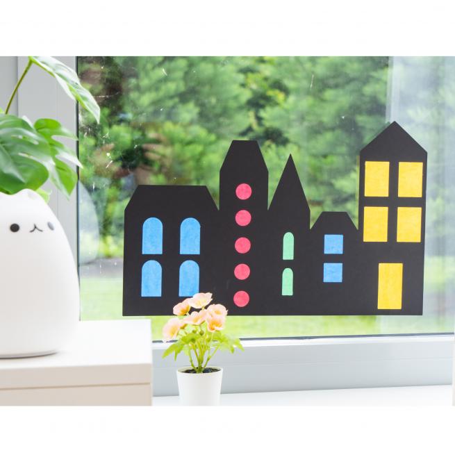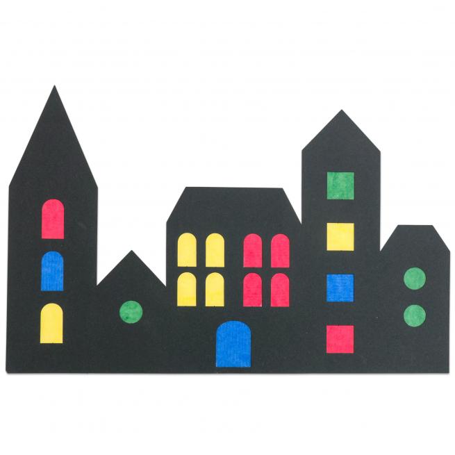 Das beiliegende Transparentpapier in Rot, Gelb, Grün und Blau schneiden die Kinder zu und hinterkleben die Fenster und Türen der Fensterbild-Stadt. Dann befestigen Sie die schicken Skylines an Fenstern, Türen oder Schränken mit Glaseinsatz. Unterschiedliche Lichtverhältnisse, wie Sonneneinstrahlung oder auch der gezielte Einsatz z. B. von Lichterketten machen die Deko lebendig. Ab 3 Jahren.