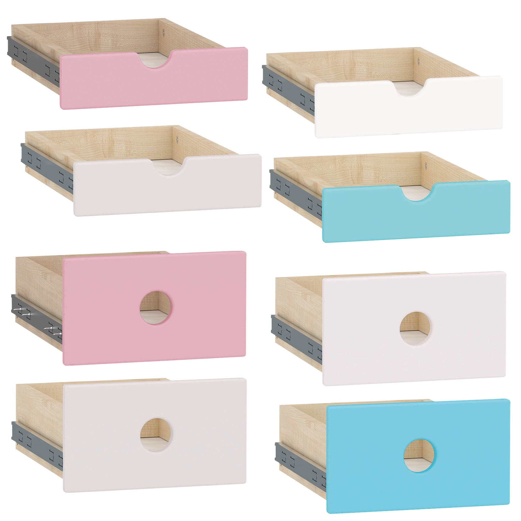 Die griffige Oberfläche sorgt für ein angenehmes Handling, während die sanfte Aussparung als Griff fungiert und zugleich für eine natürliche Belüftung sorgt. Die Schubladen bestehen aus strapazierfähigem 16 mm starkem MDF und passen millimetergenau in die Regalfächer der Feria Möbelserie.Einfache Selbstmontage – alles vorbereitet