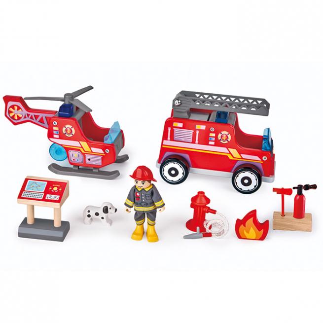 • Spielfiguren: Feuerwehrmann, Hund, Computerpult, Hydrant, Feuer, Feuerlöscher, Glocke, bewegliche Feuerwehrstange, Fahne, gelbe Satellitenschüssel