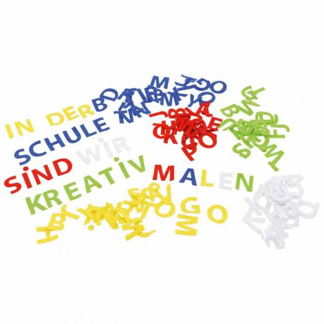 150 Großbuchstaben aus Filz in 5 Farben sortiert.