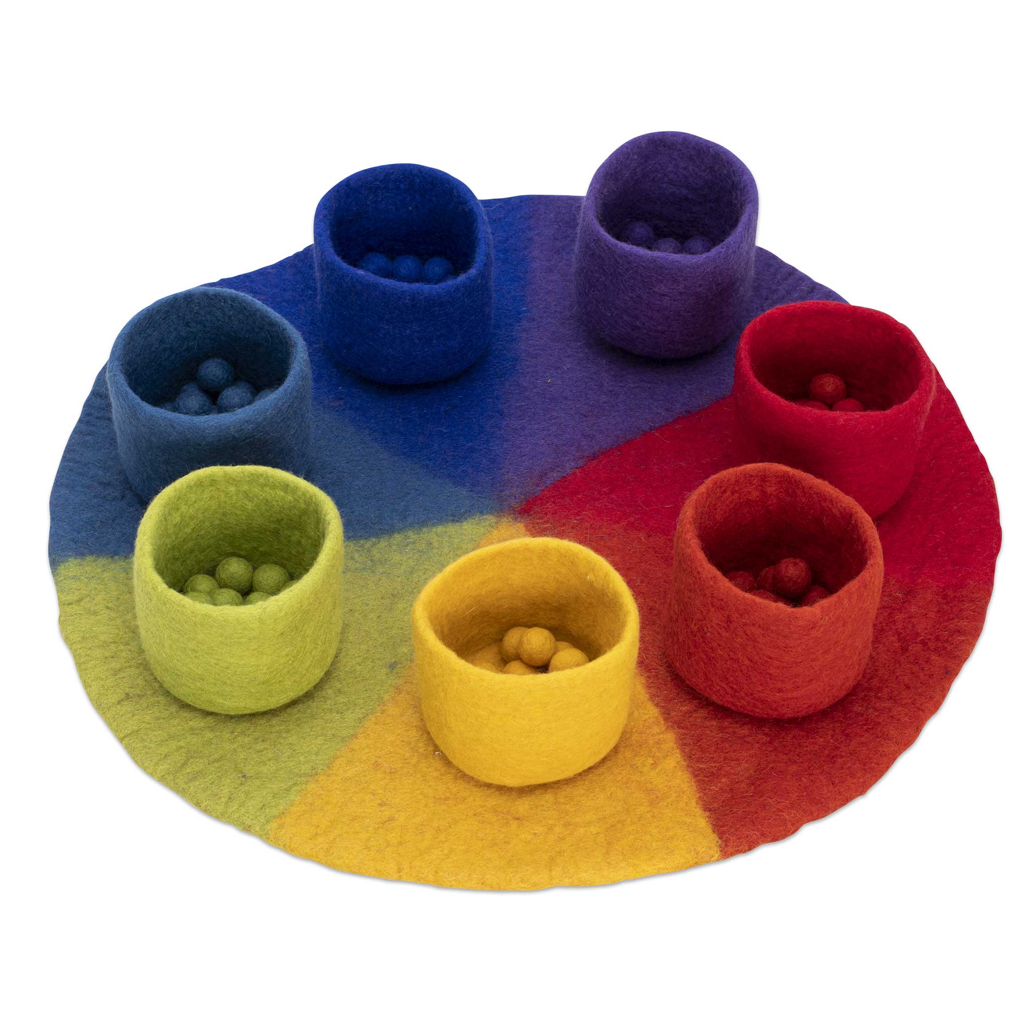 Farbzuordnungen, Legespiele oder fantasievolle Muster gestalten Sie mit Ihren Kindern auf der 7-fach geteilten Filzmatte in sanften Regenbogenfarben. Dazu nutzen Sie die 7 passenden Sortierschalen sowie die jeweils 16 farblich abgestimmten Filzkugeln. Die Kleinsten unternehmen mithilfe des Sets erste Zählversuche. Nutzen Sie die Filzmatte auch für Ihren Wochenkreis, in dem jede Farbe einen anderen Wochentag darstellt.
