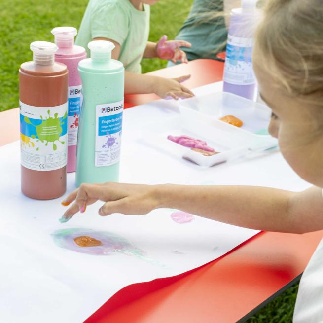 Mit Solarenergie hergestellte Fingerfarbe in kräftigen Farben zum Bemalen von Papier, Karton, Glas und vielem mehr. Die Farben sind auswaschbar.