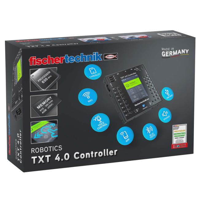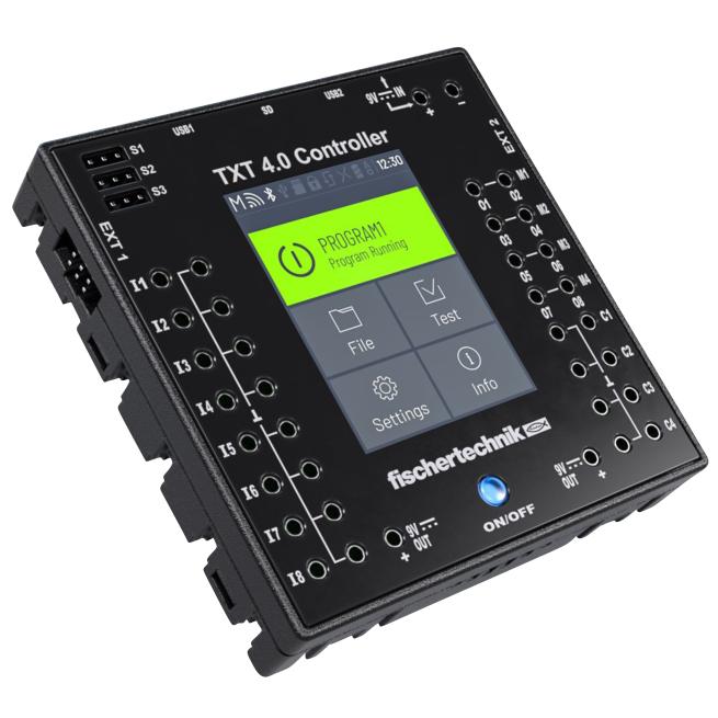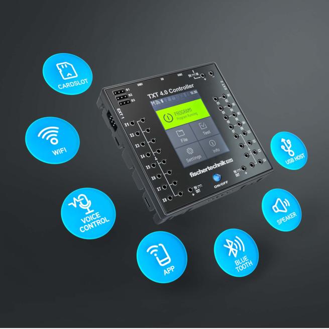 Die Programmierung des Controllers funktioniert grafisch oder via Python mithilfe der leicht verständlichen ROBO-Pro-Coding-App, die Sie zum kostenfreien Download über die gängigen Stores finden. Schnelle Datenverbindungen des TXT-Controllers zu Ihren PCs, Tablets oder Smartphones stellen Sie dabei spielend leicht mithilfe der Kombi-Schnittstelle für WLAN und Bluetooth her oder nutzen den integrierten Anschluss für Mini-USB (1 Mini-USB-Kabel im Lieferumfang). Zur direkten Steuerung des Controllers verwenden Sie das zentrale 2,4“-LCD-/TFT-Touch-Farb-Display mit übersichtlicher Menüführung und Wischgesten-Unterstützung.