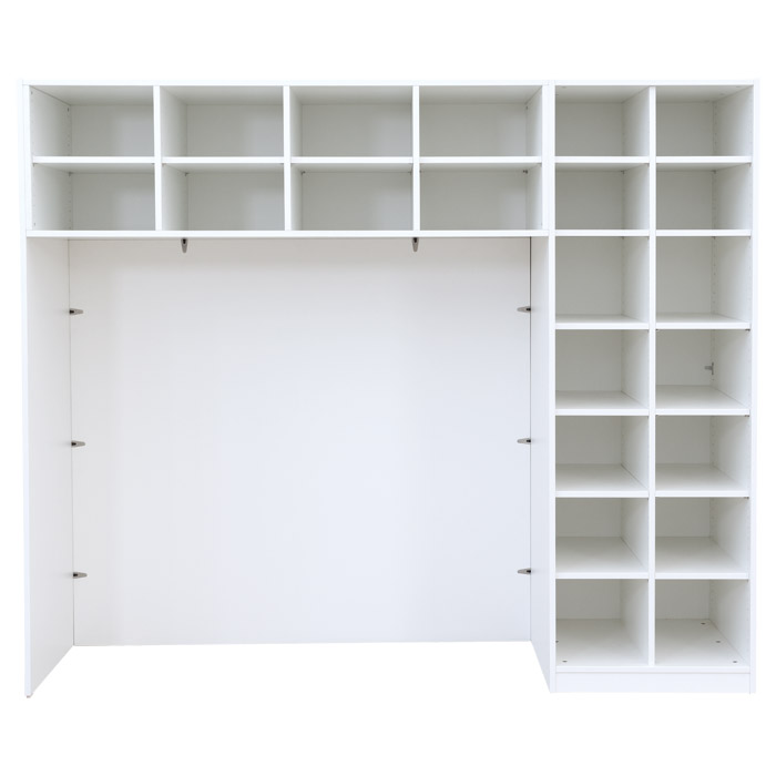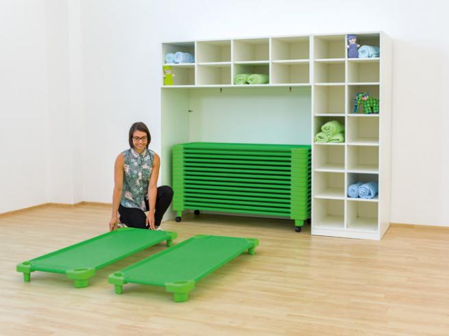 Praktisch für multifunktionale Räume. Verstauen Sie in diesem Schrank bis zu 20 Liegen samt Zubehör. In der Mitte haben die Liegen Platz. Das passende Bettzeug, Kuscheltiere und Decken verstauen Sie in den Regalfächern. So ist alles aufgeräumt und Sie nutzen den freien Platz dann einfach nach Belieben. Dank Sichtrückwand können Sie den Raum auch entsprechend in Bereiche teilen. Gefertigt aus 19 mm starken Spanplatten. Wählen Sie aus 11 Dekoren Ihre Lieblingsvariante.