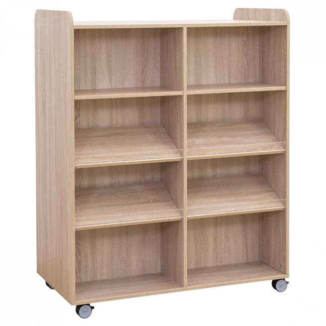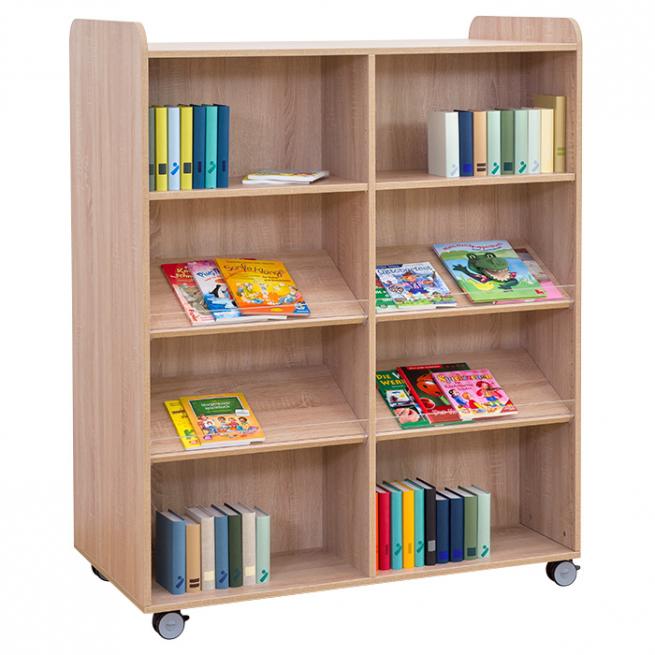 Optimal für die Leseecke oder die Schulbibliothek – diesen Bücherwagen nutzen Sie dank seiner 4 robusten und feststellbaren Leichtlaufrollen ganz flexibel. Vorder- und Rückseite sind jeweils identisch ausgestattet, somit bestens geeignet als Raumteiler. Schmal, breit, mit Mittelwand oder ohne, gerade Fachböden oder gemischt mit Schrägablagen und Plexiglas-Aufkantung.
