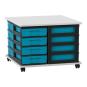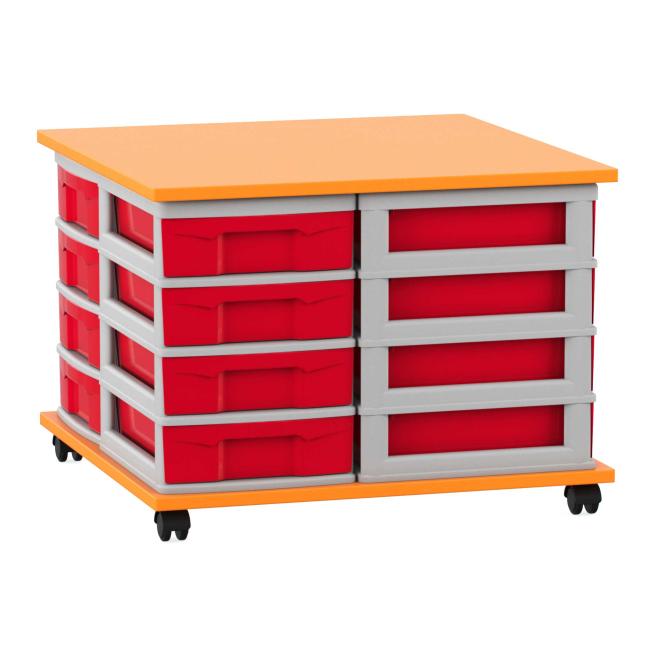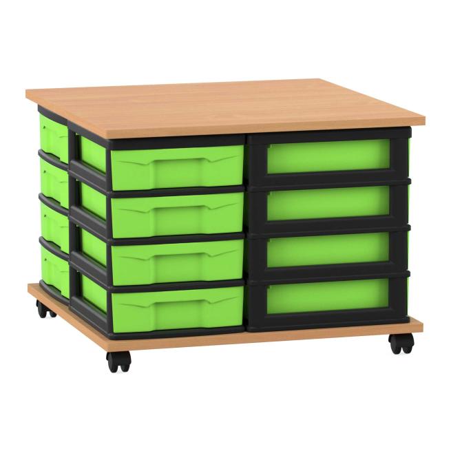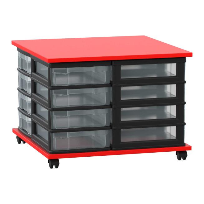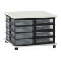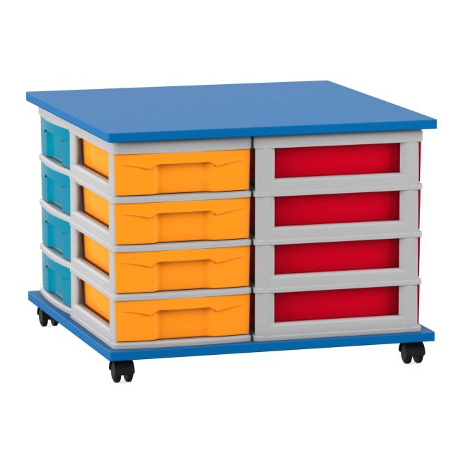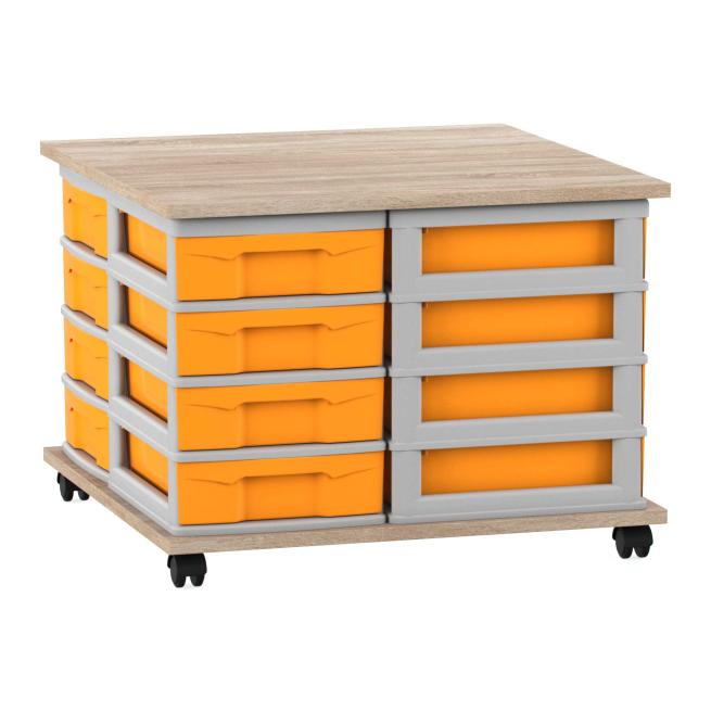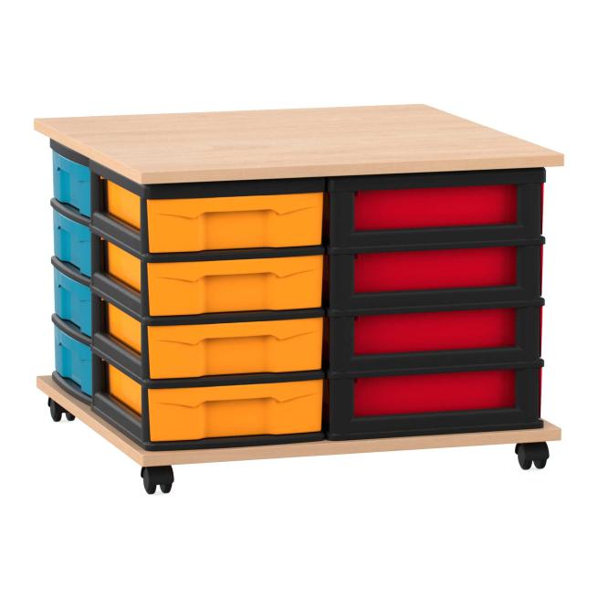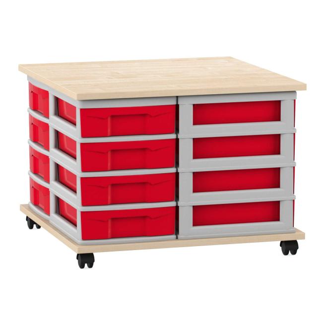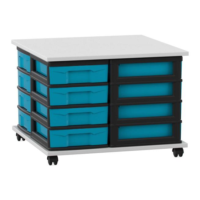 Rollende Raumwunder. Die kompakten, mobilen Container-Systeme nutzen Sie überall dort, wo Sie und Ihre Schüler z. B. Lernmaterialien oder Bastelutensilien griffbereit brauchen. Die Holzplatte nutzen Sie als praktische Ablagefläche. Erhältlich in unterschiedlichen Höhen, mit grauem oder schwarzem Rahmen sowie flachen oder hohen Boxen. Die Boxen nutzen Sie wie Schubladen. Dank Auszugssperre bleiben die auswaschbaren Boxen an Ort und Stelle. Mit feststellbaren Rollen für festen Stand.