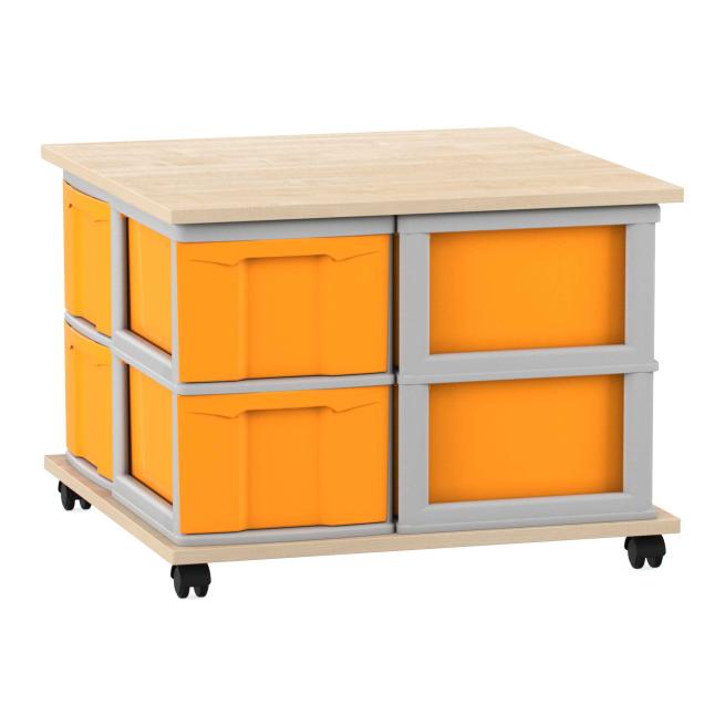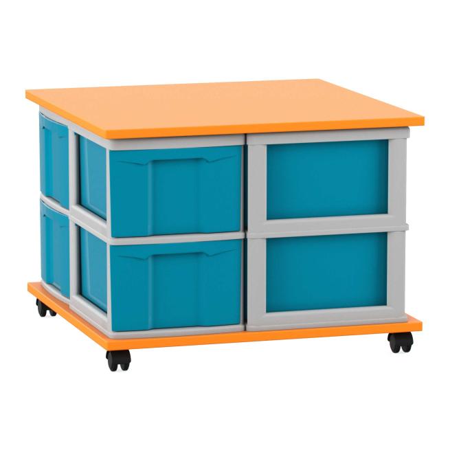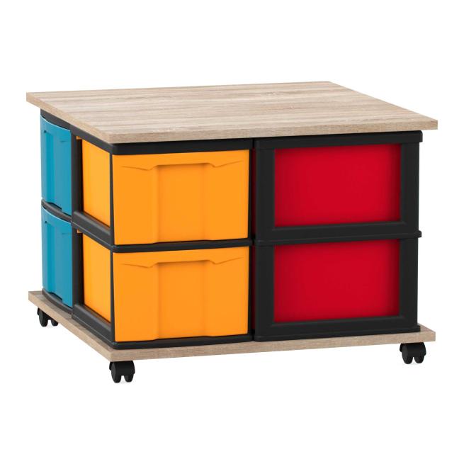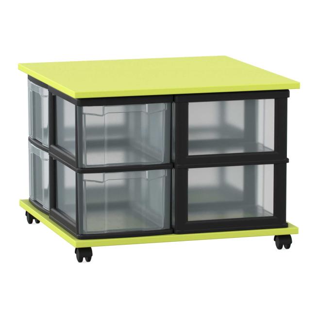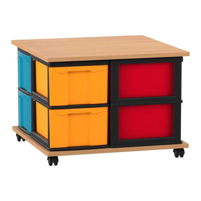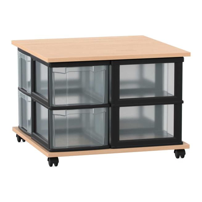 Rollende Raumwunder. Die kompakten, mobilen Container-Systeme nutzen Sie überall dort, wo Sie und Ihre Schüler z. B. Lernmaterialien oder Bastelutensilien griffbereit brauchen. Die Holzplatte nutzen Sie als praktische Ablagefläche. Erhältlich in unterschiedlichen Höhen, mit grauem oder schwarzem Rahmen sowie flachen oder hohen Boxen. Die Boxen nutzen Sie wie Schubladen. Dank Auszugssperre bleiben die auswaschbaren Boxen an Ort und Stelle. Mit feststellbaren Rollen für festen Stand.