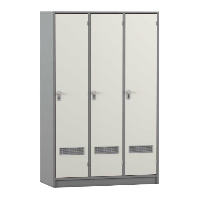 Erweitern Sie Ihre Garderobe Armadio um Schränke in unterschiedlichen Höhen und Breiten sowie um raumnutzende Eckschranklösungen in verschiedenen Höhen. Jedes Schrankfach ist mit einem individuell verstellbaren Fachboden und einem praktischen Dreifach-Garderobenhaken ausgestattet. Wählen Sie den Muschelgriff, wenn Sie mit verkürzten Türen für die Belüftung sorgen möchten. Eine bündige Tür mit Belüftungsgitter erhalten Sie zusammen mit dem Zahlenschloss. Mithilfe der Sockelversteller gleichen Sie Bodenunebenheiten aus.