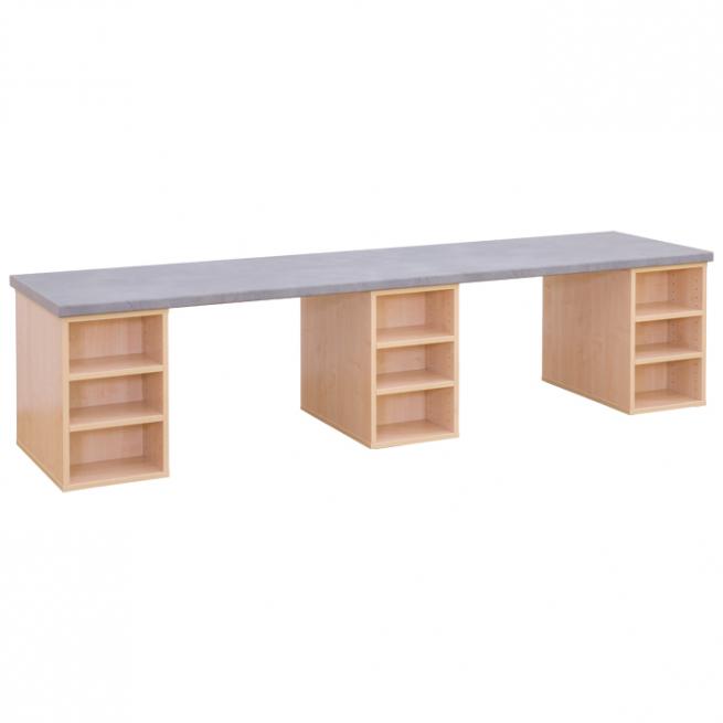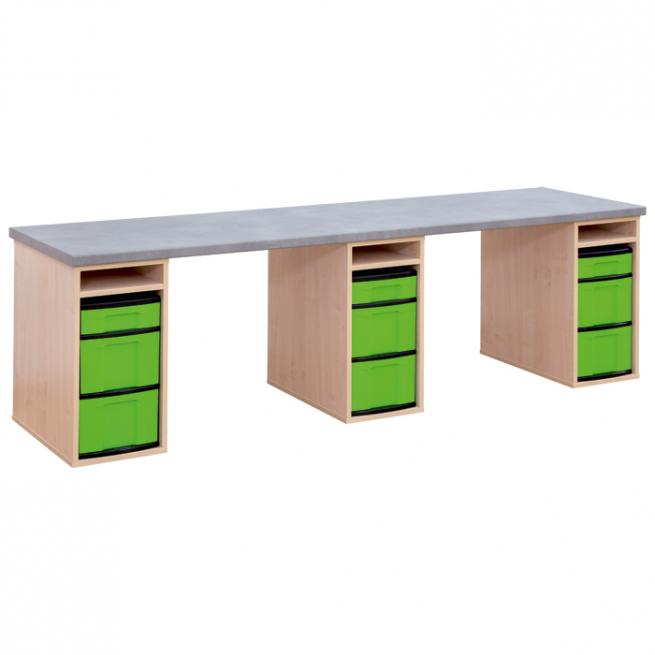 Was ergeben 2 oder 3 stabile Flexeo Regale, die beidseitig nutzbar sind und deren Vorderseiten mit praktischen Materialboxen ausgestattet sind in Verbindung mit einer superrobusten Arbeitsplatte? Genau, einen vielseitigen Materialtisch, der bestens geeignet ist für Projektarbeiten oder künstlerisches Gestalten und den Sie frei im Raum aufstellen können.