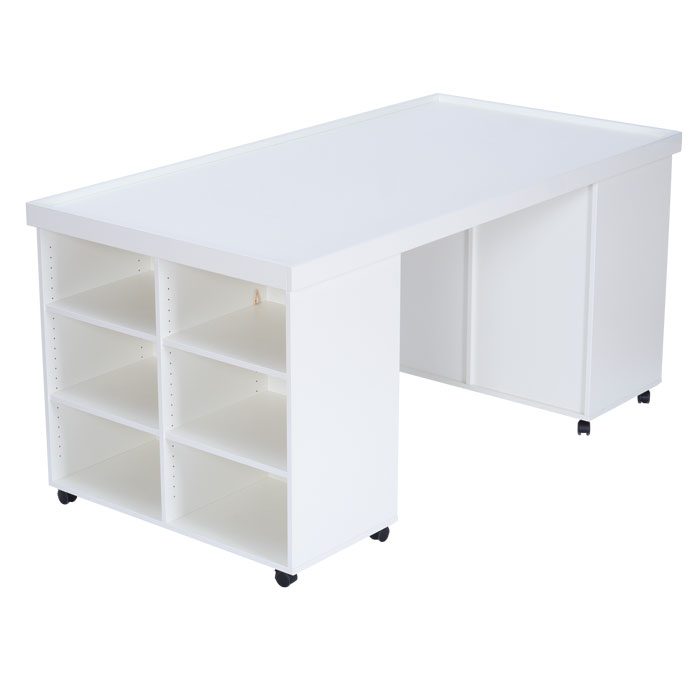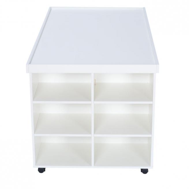 Ob künstlerische oder naturwissenschaftliche Projekte, dieser mobile Materialtisch ist der optimale Arbeitsplatz. Die riesige Arbeitsfläche nutzen auch größere Gruppen gleichzeitig. Durch die praktische Aufkantung bleiben kleinere Teile auf der Fläche und rollen nicht hinunter. In den 12 Regalfächern der beiden Unterschränke verstauen Sie bequem entsprechende Materialien, beispielsweise in praktischen Aufbewahrungsboxen. Dank der leichtgängigen Rollen transportieren oder verschieben Sie Ihren neuen Materialtisch leicht. Für den sicheren Stand sind die Rollen feststellbar. Die melaminharzbeschichtete Oberfläche ist enorm kratz-, stoß- und abriebfest sowie hygienisch und pflegeleicht. So ist der Flexeo® Materialtisch besonders langlebig und optimal geeignet für den Schulalltag.