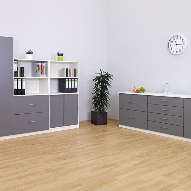 Stecken Sie es in die Schublade: Ob vier flache, verschließbare Schubladen oder zwei offene Fächer on top – mit den Schubladen-Schränken sind Sie immer top organisiert und haben ausreichend Platz für all Ihre Bedürfnisse. Zwei Schubladen entsprechen einer Ordnerhöhe, die zusätzlichen Fächer jeweils einer. So lagern Sie unterschiedliche Materialien ganz praktisch im selben Möbelstück.