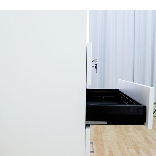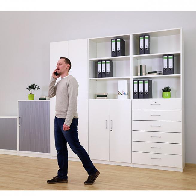 Stecken Sie es in die Schublade: Ob vier flache, verschließbare Schubladen oder zwei offene Fächer on top – mit den Schubladen-Schränken sind Sie immer top organisiert und haben ausreichend Platz für all Ihre Bedürfnisse. Zwei Schubladen entsprechen einer Ordnerhöhe, die zusätzlichen Fächer jeweils einer. So lagern Sie unterschiedliche Materialien ganz praktisch im selben Möbelstück.