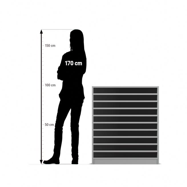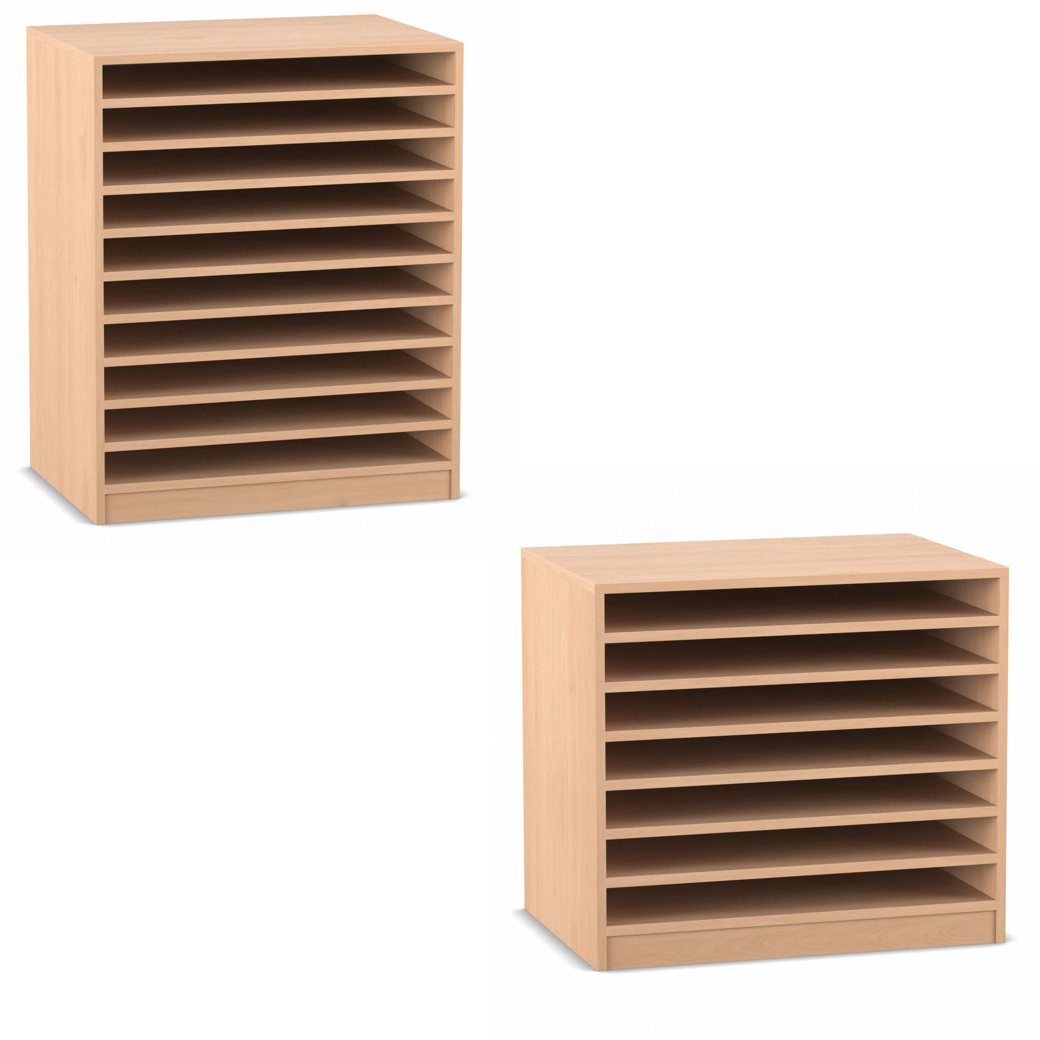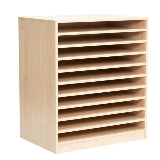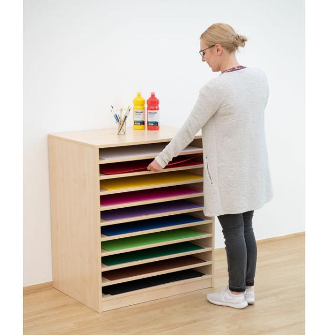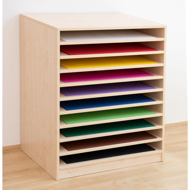 Ordentliche Papierübersicht. Verstauen Sie Papier, Fotokarton, Tonzeichenkarton und sonstige Papiersorten übersichtlich in Flexeo® Papierregal. Keine Knicke, keine Eselsohren, einfach geordnetes Papier zum leichten Entnehmen. Papierbogen bis 50 x 70 cm haben in jedem Fach Platz. Jedes Fach hat ein Innenmaß von ca. 58 x 81 cm. Die melaminharzbeschichtete Spanplatte macht das Regal robust und widerstandsfähig. Die 2-mm-ABS-Kante schützt vor Stößen und Feuchtigkeit. Verschmutzungen wischen Sie im NU mit einem feuchten Tuch ab. Sie erhalten das Flexeo® Papierregal vollständig montiert, frei Verwendungsstelle.
