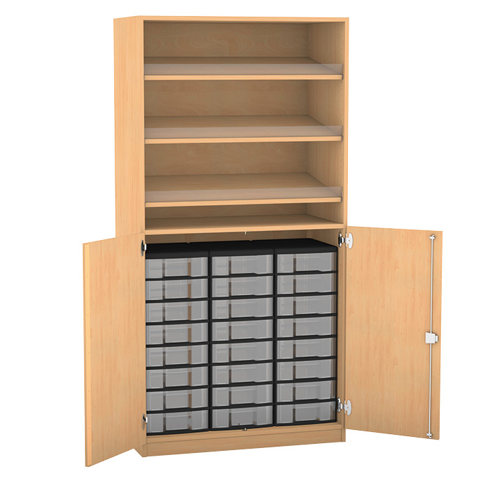 Den Schrank erhalten Sie auch wahlweise mit 24 flachen oder 12 hohen Boxen im abschließbaren Unterschrank. Zudem ist er in zwei unterschiedlichen Breiten lieferbar.