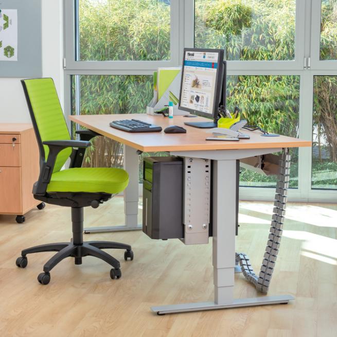 Sitzend oder stehend, dank den Flexeo® Schreibtischen wird die Arbeitshöhe im Handumdrehrehen angepasst.