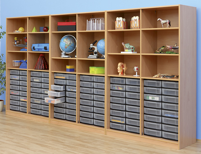 18 offene Regalfächer, 48 große oder 96 flache Schubladen – die Regalwand Altair bietet Platz in Hülle und Fülle. Ganz gleich, ob Sie die Regalwand mit schweren Büchern oder Anschauungsmaterial für den Unterricht bestücken – der 19 mm starke Korpus und die ebenfalls 19 mm starken Böden machen das Regal standfest und stabil. Die eingelassene 19 mm starke Rückwand wirkt dem gefährlichen Kippeffekt entgegen. Besonders schulalltagtauglich ist die hochwertige Melaminharzbeschichtung, die einfach feucht abgewischt werden kann. Abnutzungserscheinungen sowie Schutz vor Stößen und Feuchtigkeit bietet die ABS-Kante von 2 mm.