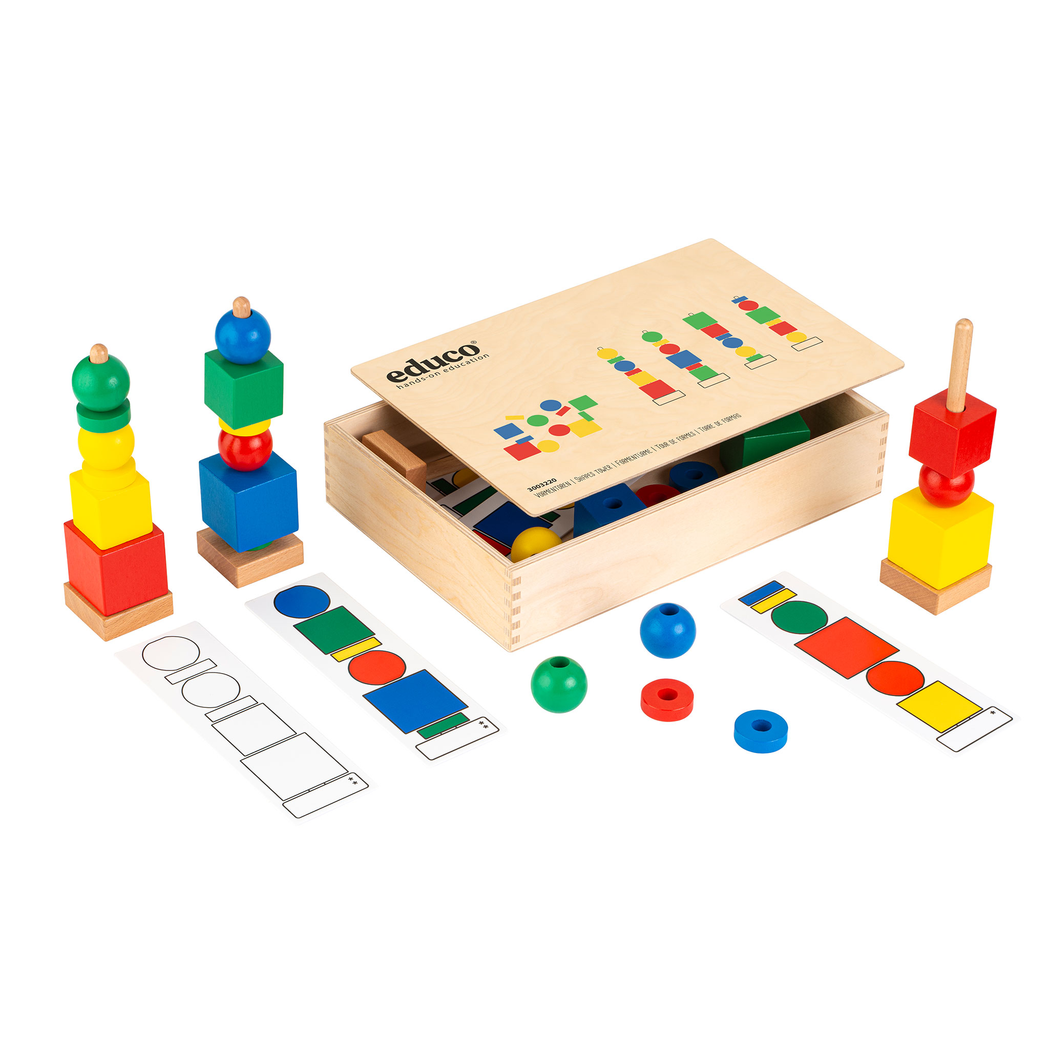 Anhand der Aufgabenkarten bauen die Kinder bunte Türme. Dabei lernen sie verschiedene Farben, Größen und Formen voneinander zu unterscheiden und ein 2D-Bild in ein 3D-Bauwerk umzuwandeln. Die bunten Bauklötze fördern die Hand-Auge-Koordination und die Feinmotorik. Anhand der Aufgabenkarten entnehmen die Kinder die zu bauenden Modelle. Die Aufgaben steigen in ihrem Schwierigkeitsgrad.