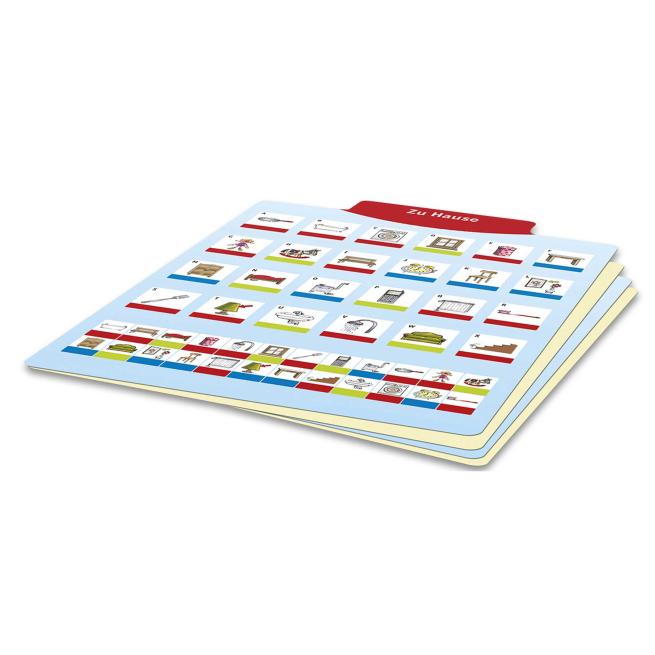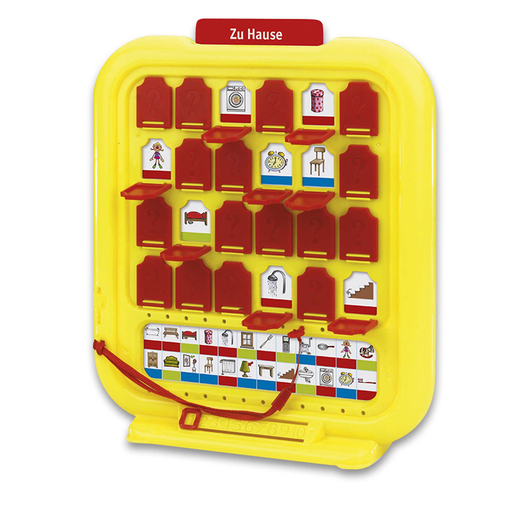 Ihre sprachlichen, sozialen und kognitiven Kompetenzen trainieren Kinder mithilfe dieses Spiels. Dabei üben sie Begriffe aus den Themengebieten Haushalt, Tiere, Lebensmittel sowie Schule und Spielen. Ziel ist es, das Bild des Mitspielers zu erraten. Dafür müssen die Kinder möglichst genaue Fragen stellen. Dazu sind auf jeder Spielkarte 24 Wörter abgebildet. Nachdem die Kinder für sich je ein Bild ausgewählt haben, markieren sie es mit einem Steckstift und beginnen dann das Abfragen. Beim Zuordnen des jeweils korrekten Artikels helfen die farbigen Felder unter den Bildern (rot: die, grün: das, blau: der). Beim Fragestellen haben die Kinder die Wahl zwischen dem Nominativ („Ist es der Stuhl?“) und dem Akkusativ („Hast du den Stuhl?“). So prägen sie sich auch spielend das Verwenden des korrekten Falles ein.