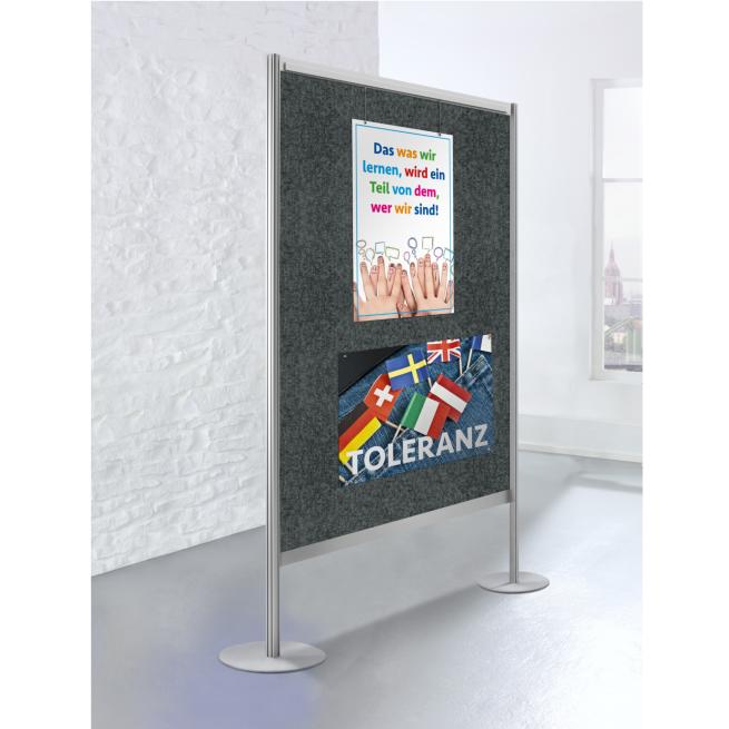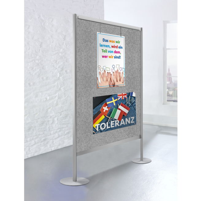 Die freistehende Ausstellungswand ist absolut vielseitig und einfach superpraktisch: Ihre hochwertige Verarbeitung, das kompakte, zeitlose Design und ihr flexibles Aufstellungsprinzip machen sie zum idealen Ausstattungselement – auch für Ihre Schule oder Ihr Museum! Die freistehende Ausstellungswand ist für die solitäre Aufstellung vorbereitet, Sie erhalten diese standardmäßig mit Metallfußplatten zur einfachen Selbstmontage. Nutzen Sie die Wand als Raumteiler sowie als erweiterte Ausstellungsfläche – die perfekte Unterstützung zur Präsentation von Schul- und Kunstprojekten oder zur Durchführung von Wechselausstellungen.