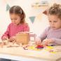 Spielgabe 5P für erstes Rechnen und Teilen: geviertelte Holzringe und Zahlenwürfel