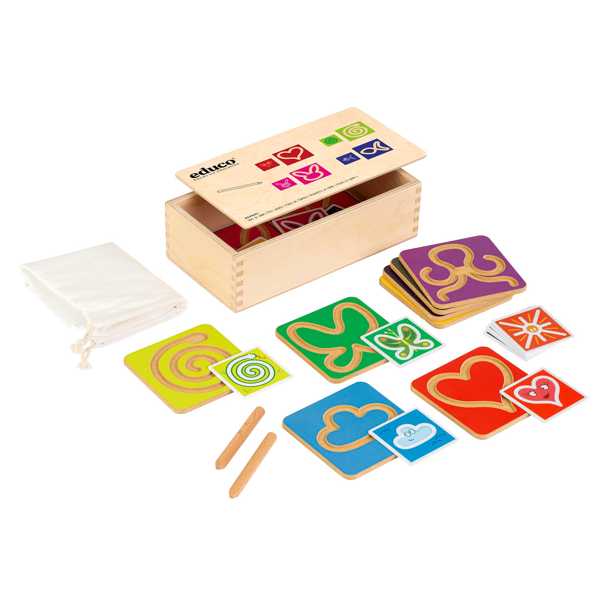 Dieses Spiel fördert nicht nur die Grob- und Feinmotorik, sondern auch den Tastsinn und erste Schreibbewegungen. Die Kinder können die verschiedenen Übungen auf den Holzbrettchen mit den Fingern erfühlen oder mit dem Holzstift nachfahren. Außerdem kann aus den Plättchen und den Karten ganz einfach ein Memoryspiel erstellt werden. Das Tastspiel ist ein vielseitiges Lernspielzeug, das Kindern hilft, ihre Sinne zu schärfen und ihre kognitiven Fähigkeiten zu entwickeln. Ab 3 Jahren.