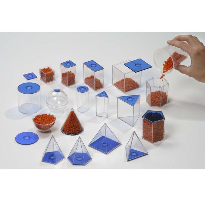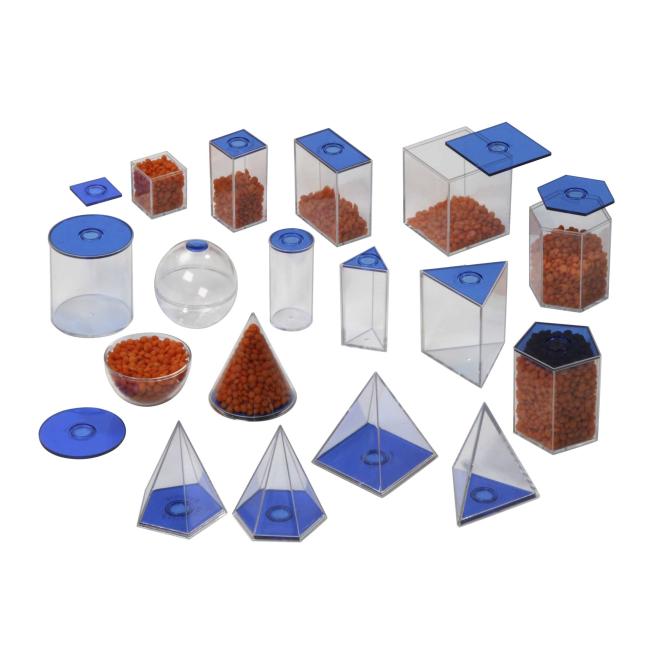 Die Grundflächen der Modelle lassen sich abnehmen. Ihre Schüler erfahren, welche Grundfläche zu welchem Körper passt. Die Körper können mit flüssigem oder festem Material befüllt werden. Die Schüler schütten die Inhalte von einem Körper in einen anderen und lernen dabei Rauminhalte kennen. Alle Modelle bestehen aus 2 mm starkem Plexiglas und sind sehr stabil. Das Set besteht aus den 17 abgebildeten Modellen.