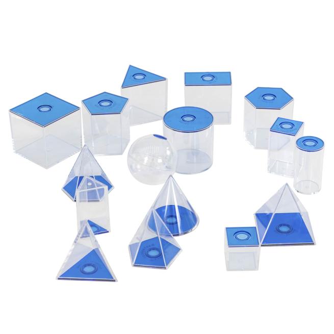 Die Grundflächen der Modelle lassen sich abnehmen. Ihre Schüler erfahren, welche Grundfläche zu welchem Körper passt. Die Körper können mit flüssigem oder festem Material befüllt werden. Die Schüler schütten die Inhalte von einem Körper in einen anderen und lernen dabei Rauminhalte kennen. Alle Modelle bestehen aus 2 mm starkem Plexiglas und sind sehr stabil. Das Set besteht aus den 17 abgebildeten Modellen.