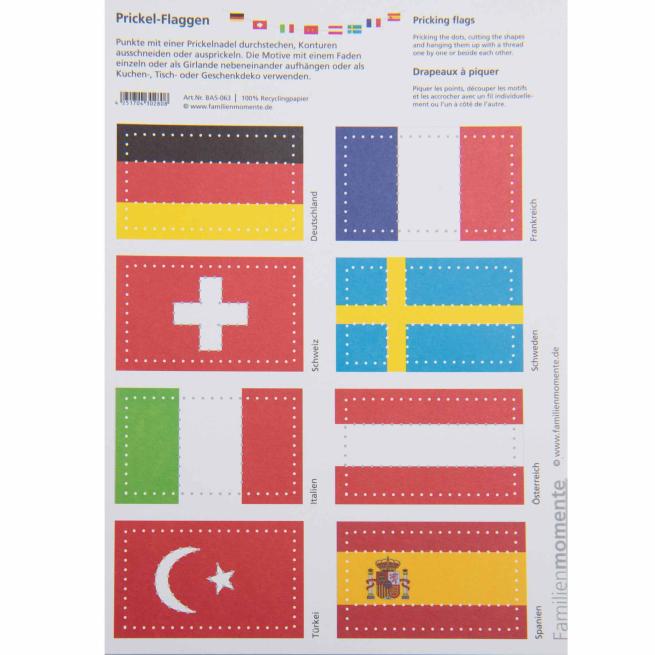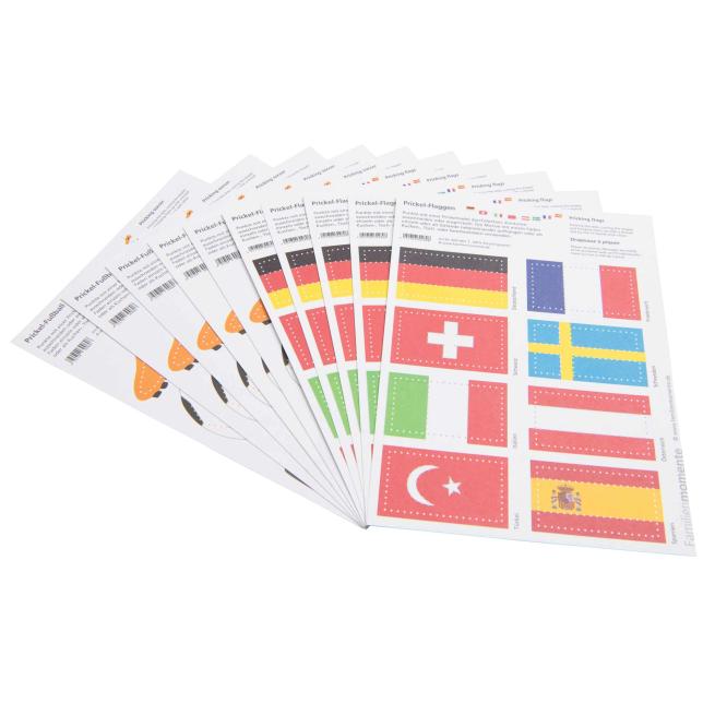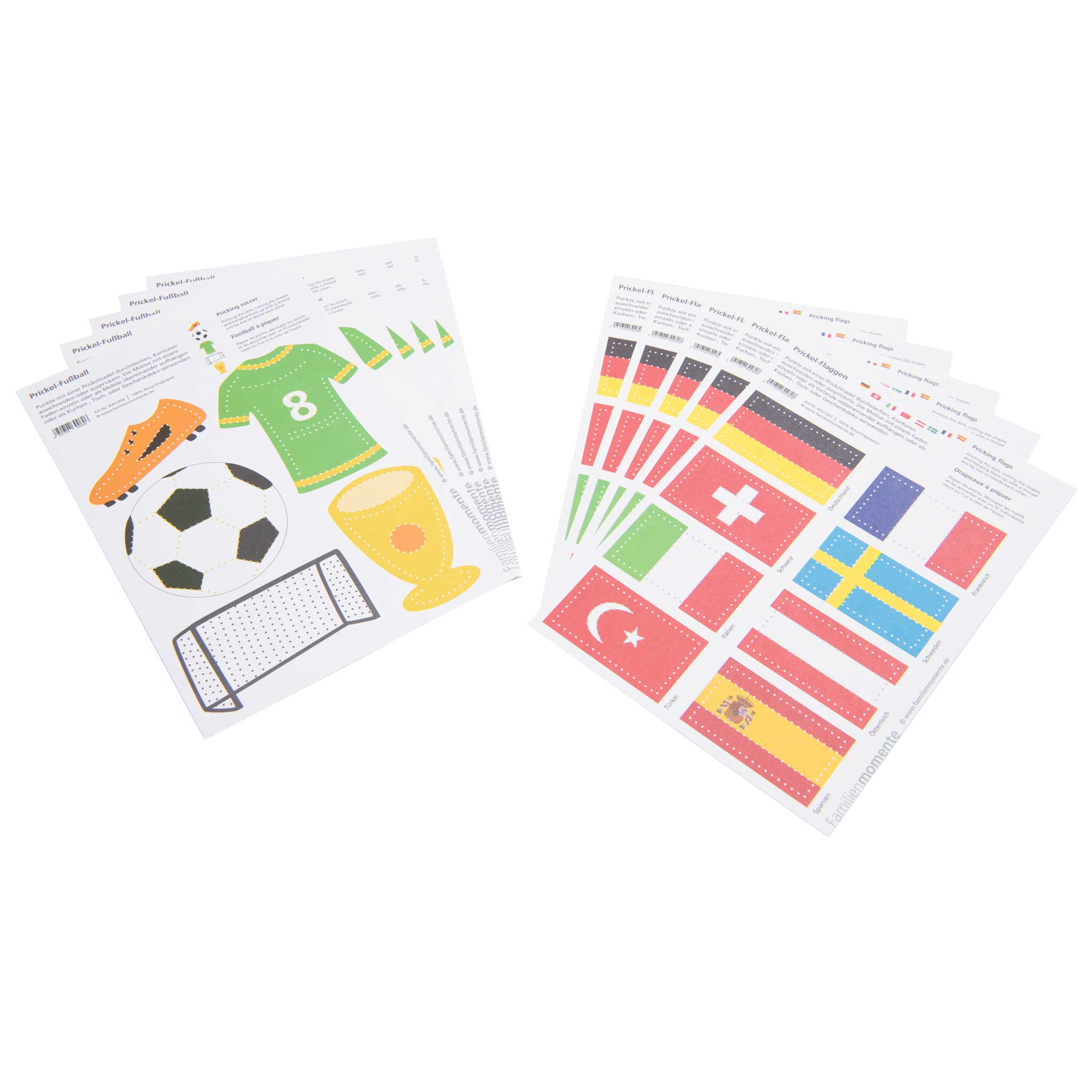 Eine schnelle Fußball-Deko basteln Ihre Kinder aus den 10 Prickel-Motivbogen ganz flink und selbstständig. Die Vorlagen sind beidseitig bedruckt. Im Nu prickeln die Kinder die einzelnen Motive aus. Die Prickelpunkte sind auf dem Recyclingpapier entsprechend vorgedruckt. Die ausgeprickelten Fußball-Motive und Flaggen hängen Sie gemeinsam z. B. als Mobiles oder auch Girlanden auf.