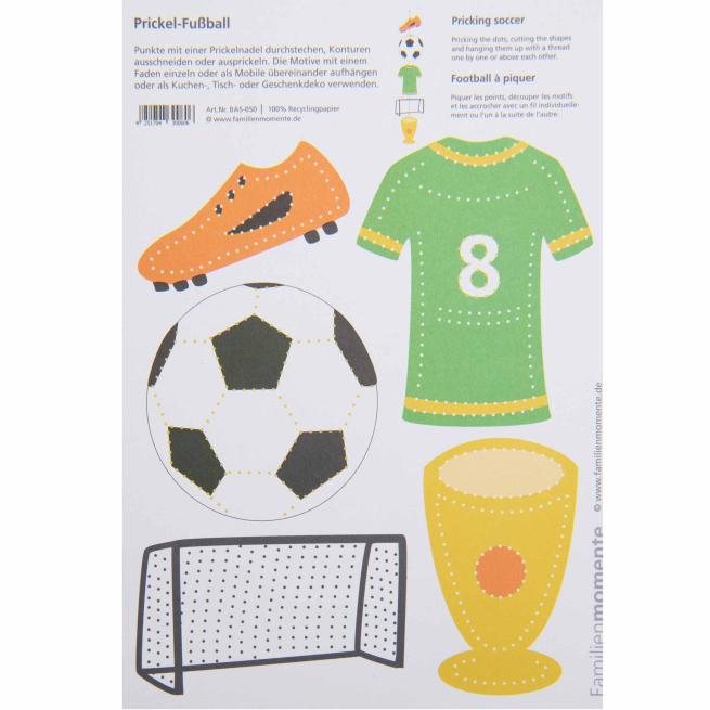 Prickeln macht nicht nur Spaß, sondern liefert den Kindern auch enorm schnelle Erfolgserlebnisse. Neben ihrer Auge-Hand-Koordination fördert Prickeln auch das kindliche Geschick. Das Lieblingsthema Fußball motiviert die Kinder zudem, sich beim Ausprickeln zu konzentrieren. Im Handumdrehen prickeln sie Fußballschuh, Trikot, Fußball, Tor, Pokal und die Flaggen von Deutschland, Frankreich, Schweiz, Schweden, Italien, Österreich, Türkei sowie Spanien aus. Mit einer Nadel und einem dünnen Nylonfaden (beides nicht enthalten) entstehen Mobiles oder Girlanden.Das Wichtigste auf einen Blick