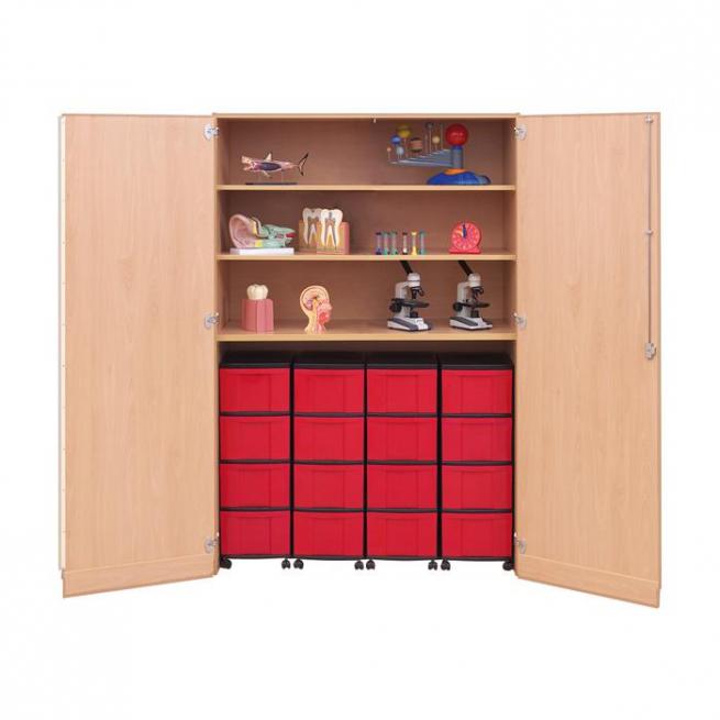 Die Schränke sind zweitürig mit Drehstangenschloss und verstellbaren Böden im Oberteil. Dank der hochwertigen Bauweise mit 19 mm starker Rückwand und der dicken Regalböden stehen die Garagenschränke enorm stabil auf dem Boden. Die Container schieben Sie einfach aus dem Schrank direkt in den Klassenraum.