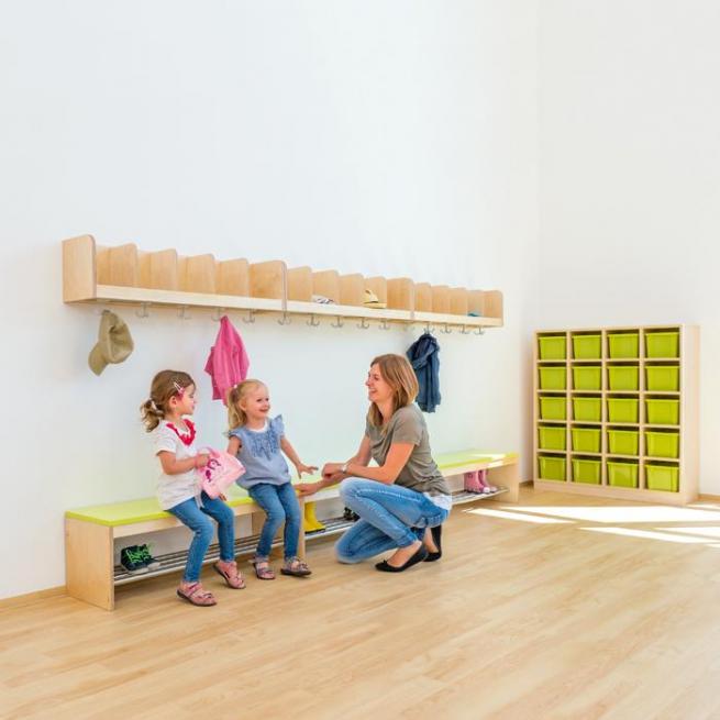 Die Garderobenleisten schaffen Übersicht. Hier hat jedes Kind seinen eigenen Platz. An den abgerundeten Dreifachhaken hängen auch die Kleinen bequem ihre Jacken und Mäntel auf. Oberhalb der stabilen Haken bieten geräumige Fächer genügend Platz für Mützen, Handschuhe und andere Utensilien.