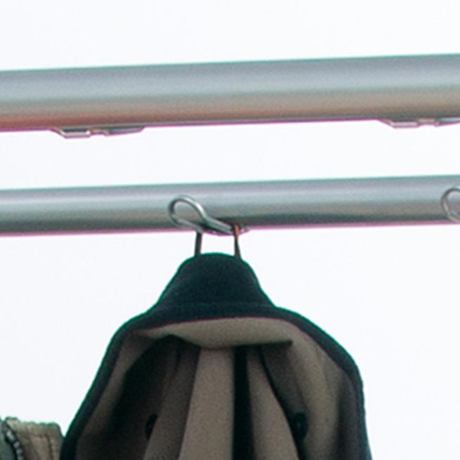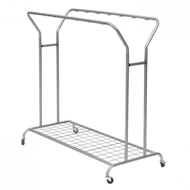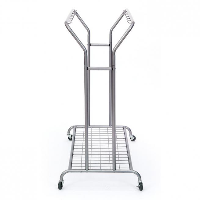 Die fahrbare Garderobe bietet viel Platz für Jacken, Taschen und Schuhe. Sie ist doppelseitig nutzbar, ausgestattet mit 7 Haken an jeder Seite und einer extra breiten Metallgitter-Ablage. Die stabile Metallkonstruktion macht den Garderobenwagen standsicher.