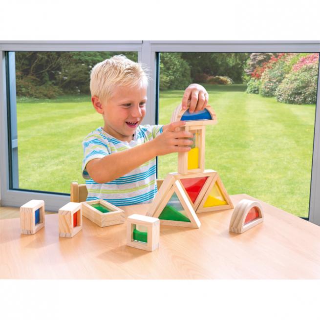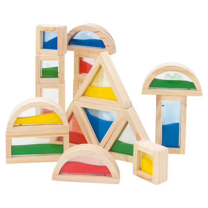 Da baut das Auge mit. Diese besonderen Bausteine sind mit Glitterflüssigkeit oder Sand in leuchtenden Farben gefüllt – Bauwerke werden damit zum Hingucker. Die jeweils vier unterschiedlichen Formen sind in einem besonders robusten Holzrahmen eingefasst.