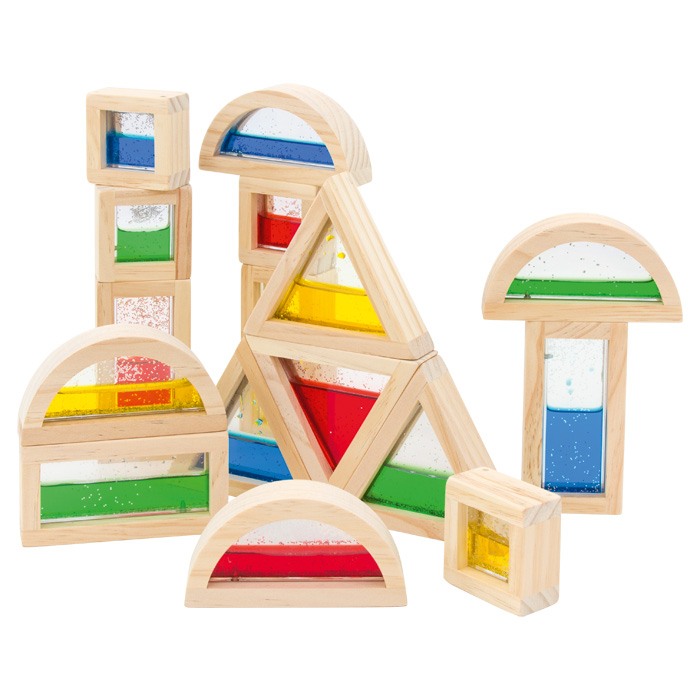 Da baut das Auge mit. Diese besonderen Bausteine sind mit Glitterflüssigkeit oder Sand in leuchtenden Farben gefüllt – Bauwerke werden damit zum Hingucker. Die jeweils vier unterschiedlichen Formen sind in einem besonders robusten Holzrahmen eingefasst.