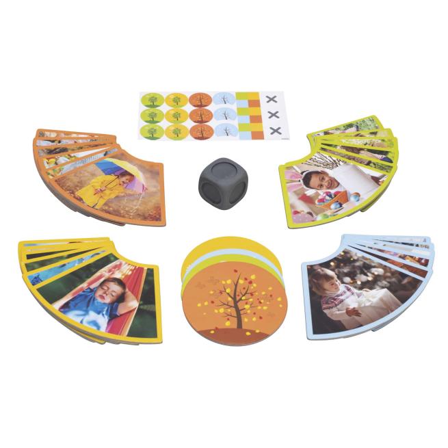 Das Würfel- und Legespiel "Genieße die Jahreszeiten" zeigt auf 24 großen Bildkarten echte Fotos jahreszeittypischer Aktivitäten. Die Bildkarten legen die Kinder an die passende runde Jahreszeiten-Karten an und werfen hierzu vorher mit dem großen Würfel. Die dargestellten Tätigkeiten, z. B. das Bemalen von Ostereiern, Sandburgenbau am Strand oder das Herumtollen im Schnee, stammen dabei aus der Erfahrungswelt der Kinder und haben für diese einen hohen Wiedererkennungswert.