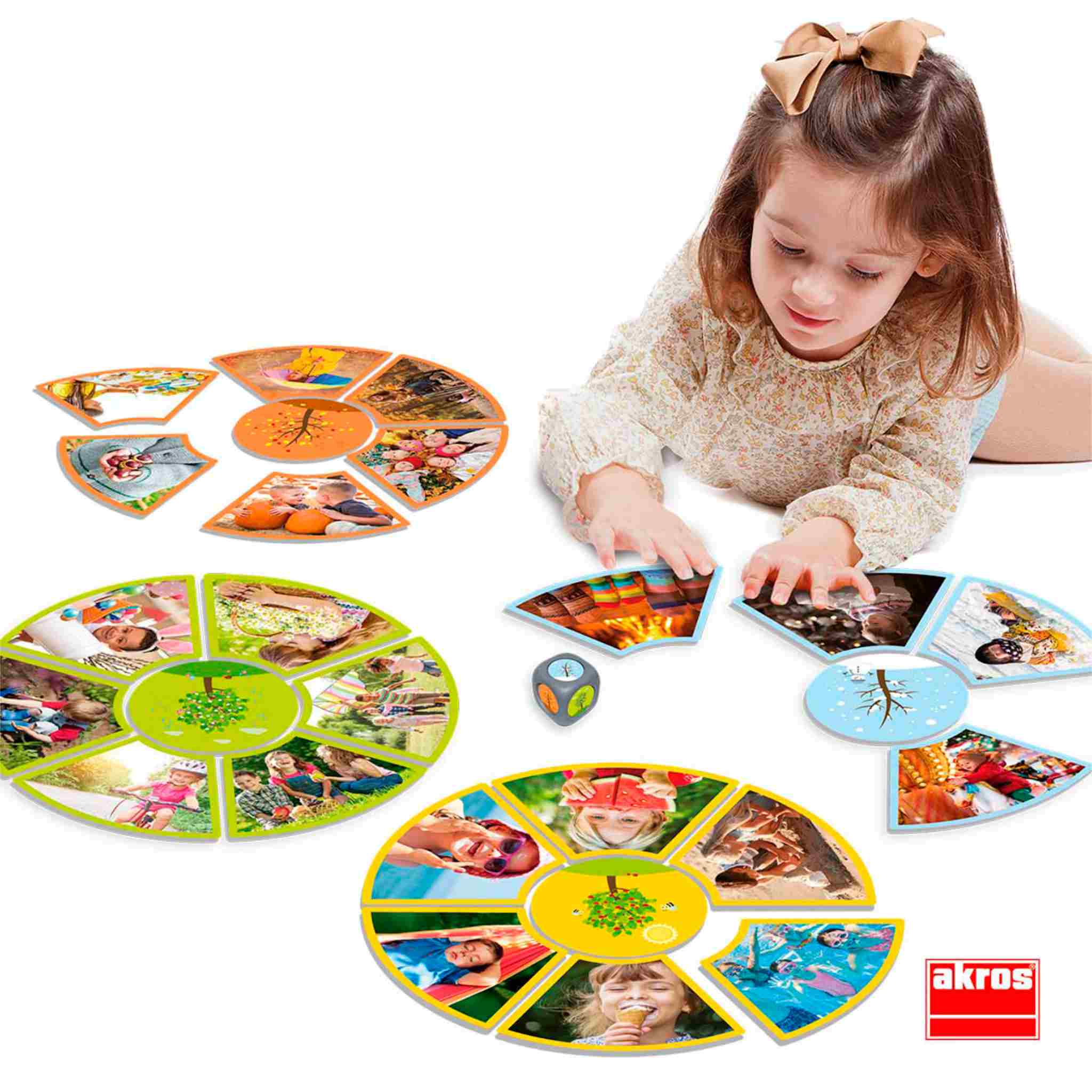 Und so funktioniert's: Zu Beginn ihres Spielzuges würfeln die Kinder mit dem griffigen Maxi-Würfel eine Jahreszeit aus. Anschließend ordnen sie dieser eine Tätigkeit zu, indem sie aus dem Fundus der Bildkarten eine ihrer Meinung nach passende Darstellung an eine der runden Jahreszeitenkarten anlegen. Die Jahreszeiten-Symbole auf Würfel und runden Anlegekarten sehen dabei identisch aus und vereinfachen den Spielfluss. Spezifisch gefärbte Ränder der jeweils zusammengehörigen Karten erleichtern zudem die Zuordnung und ermöglichen eine einfache Selbstkontrolle.